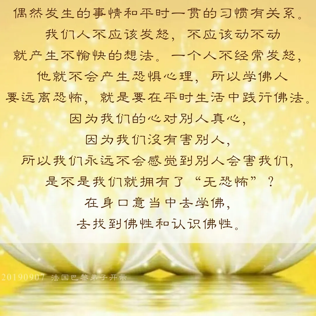 这个笑话告诉大家,偶然发生的事情和平时一贯的习惯有关系。我们人不应该发怒,不应该动不动就产生不愉快的想法。一个人不经常发怒,他就不会产生恐惧心理,所以学佛人要远离恐怖,就是要在平时生活中践行佛法。因为我们的心对别人真心,因为我们没有害别人,所以我们永远不会感觉到别人会害我们,是不是我们就拥有了“无恐怖”?在身口意当中去学佛,去找到佛性和认识佛性。有时候用包容可以使自己平安,用宽容可以使自己吉祥,用慈悲的爱可以换来人间的吉祥。
