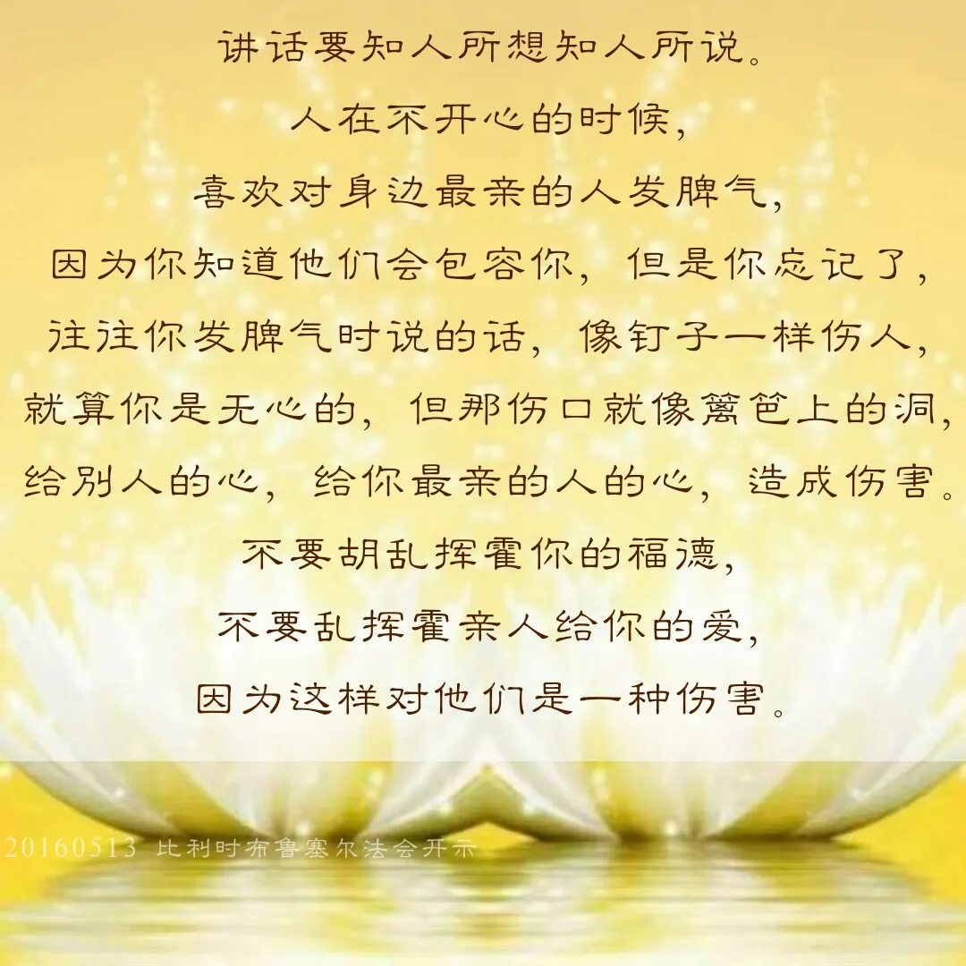 每个人的话语就像真实的刺伤别人一样,令人无法承受。所以,讲话要知人所想,知人所说。人在不开心的时候,喜欢对身边最亲的人发脾气,因为你知道他们会包容你,但是你忘记了,往往你发脾气时说的话,像钉子一样伤人,就算你是无心的,但那伤口就像篱笆上的洞,给别人的心,给你最亲的人的心,造成伤害不要胡乱挥霍你的福德,不要乱挥霍亲人给你的爱,因为这样对他们是一种伤害。学佛人以慈悲善良对人,瞋恨永远不能化解瞋恨,只有慈悲才能化解仇恨,这就是真理。不必与因果去争吵,因为因果从来不误人,对人尊重就是庄严自己,尊重别人就是尊重自己,让别人幸福的人,自己一定是一个最幸福的人。