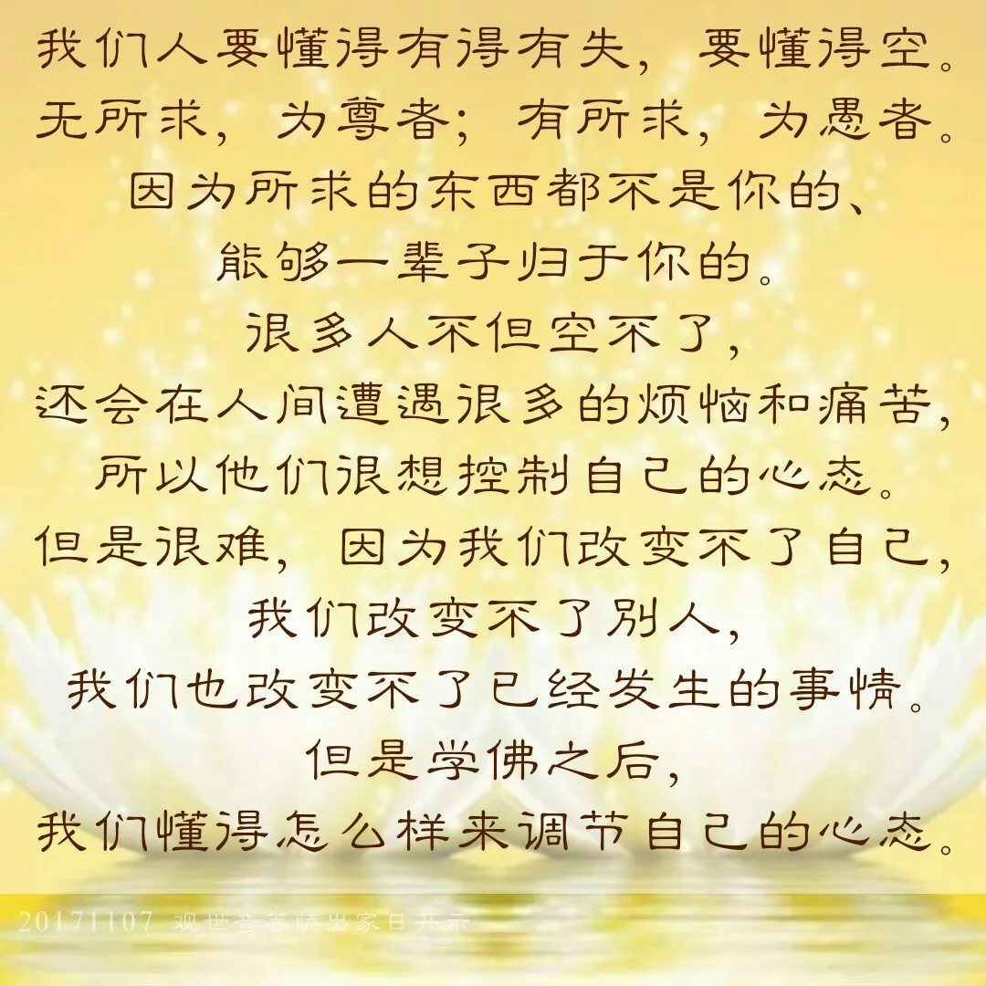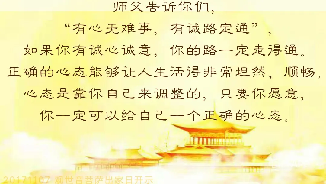 这就是告诉我们,我们人要懂得有得有失,要懂得空。无所求,为尊者;有所求,为愚者。 因为所求的东西都不是你的、能够一辈子归于你的。很多人不但空不了,还会在人间遭遇很多的烦恼和痛苦,所以他们很想控制自己的心态。但是很难,因为我们改变不了自己,我们改变不了别人,我们也改变不了已经发生的事情。但是学佛之后,我们懂得怎么样来调节自己的心态。师父告诉你们,“有心无难事,有诚路定通”,如果你有诚心诚意,你的路一定走得通。正确的心态能够让人生活得非常坦然、顺畅。心态是靠你自己来调整的,只要你愿意,你一定可以给自己一个正确的心态。