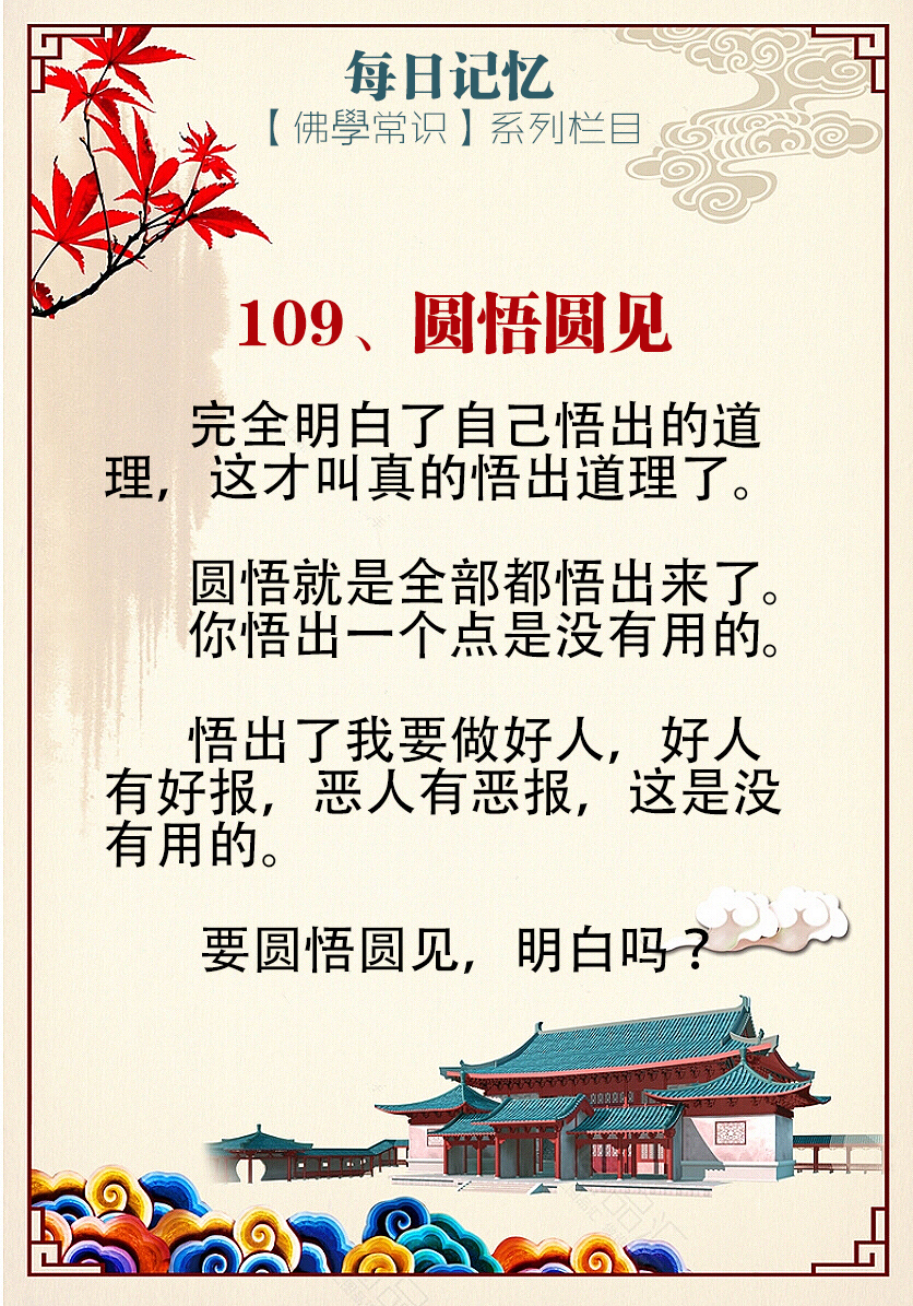 109.圆悟圆见☆☆☆☆☆☆☆☆☆圆悟圆见完全明白了自己悟出的道理,这才叫真的悟出道理了。圆悟就是全部都悟出来了。你悟出一个点是没有用的。悟出了我要做好人,好人有好报,恶人有恶报,这是没有用的。要圆悟圆见,明白吗?---白3-36、学佛有“三力”,妙心始悟佛