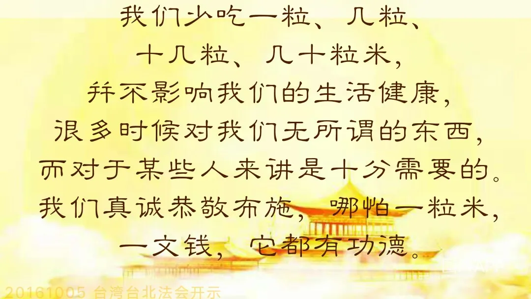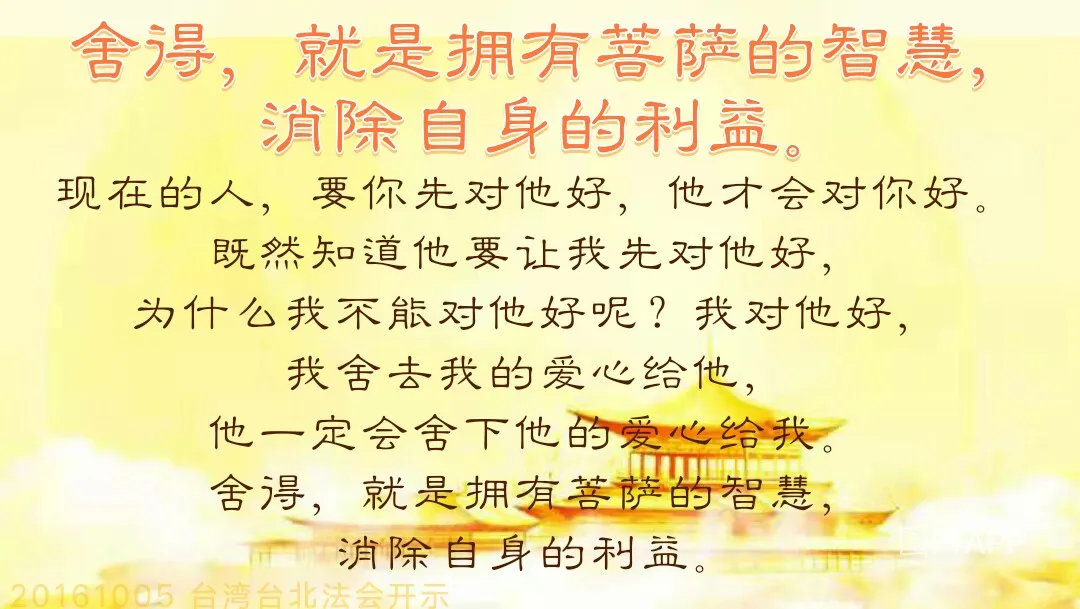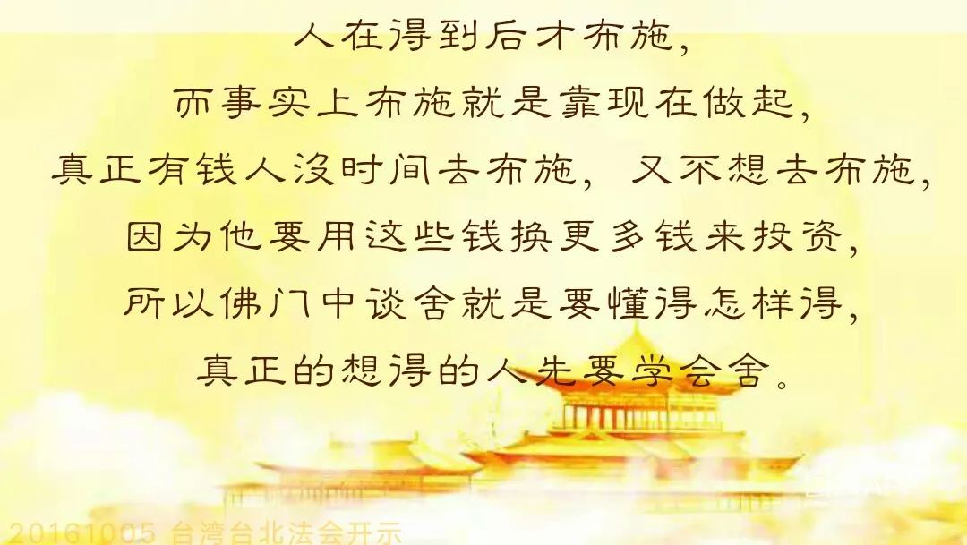 我们少吃一粒、几粒、十几粒、几十粒米,并不影响我们的生活健康,很多时候对我们无所谓的东西,而对于某些人来讲是十分需要的。我们真诚恭敬布施,哪怕一粒米,一文钱,它都有功德。人在得到后才布施,而事实上布施就是靠现在做起,真正有钱人没时间去布施,又不想去布施,因为他要用这些钱换更多钱来投资,所以佛门中谈舍就是要懂得怎样得,真正的想得的人先要学会舍。现在的人,要你先对他好,他才会对你好。既然知道他要让我先对他好,为什么我不能对他好呢?我对他好,我舍去我的爱心给他,他一定会舍下他的爱心给我。舍得,就是拥有菩萨的智慧,消除自身的利益。