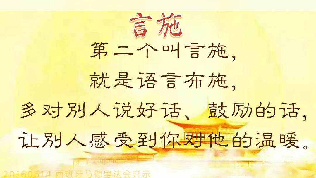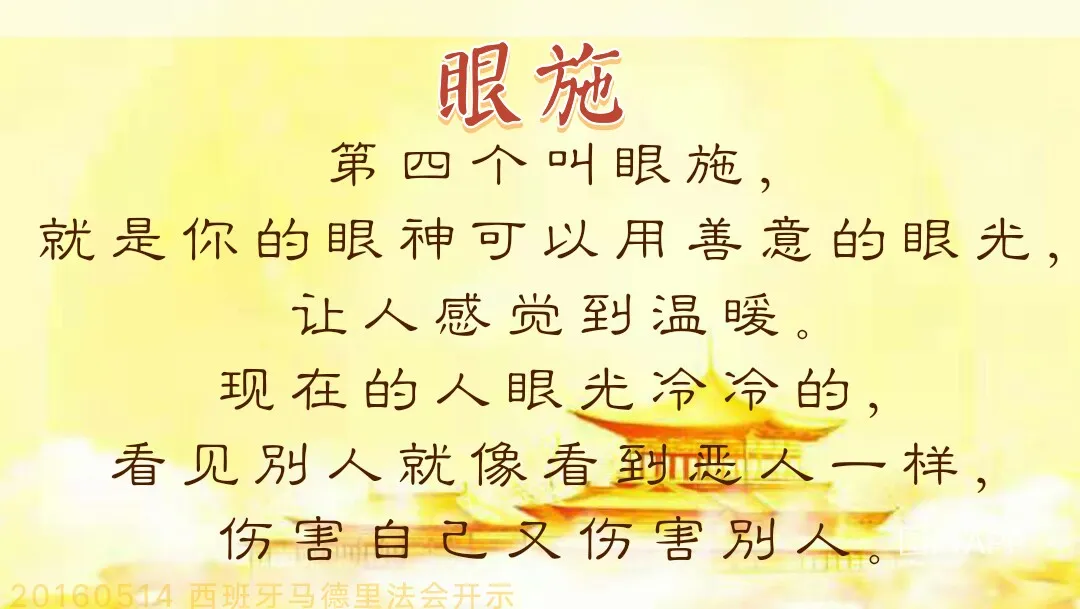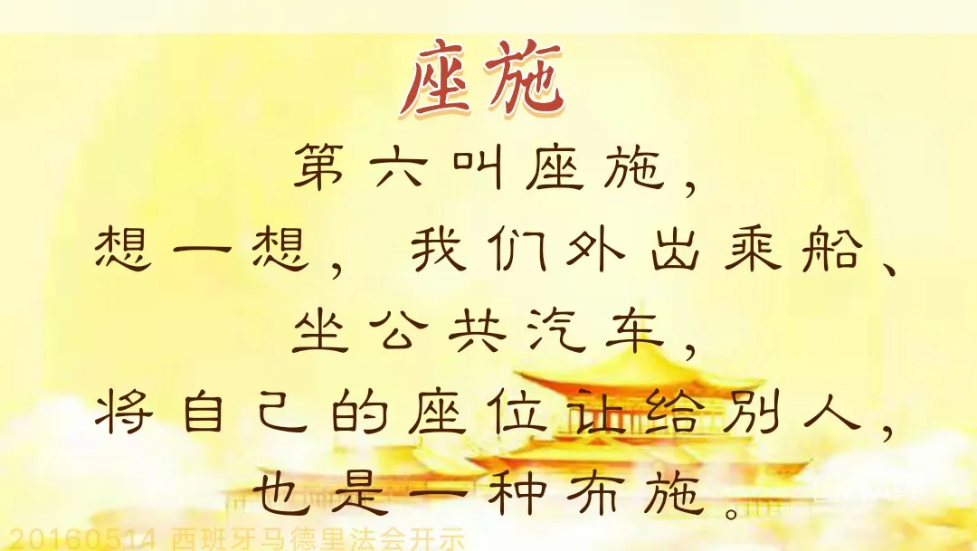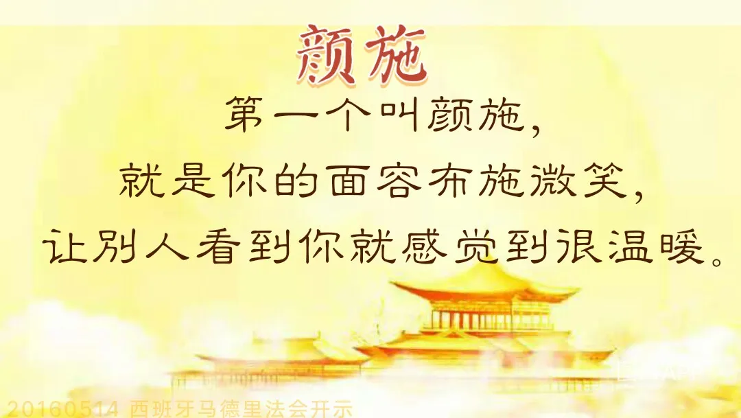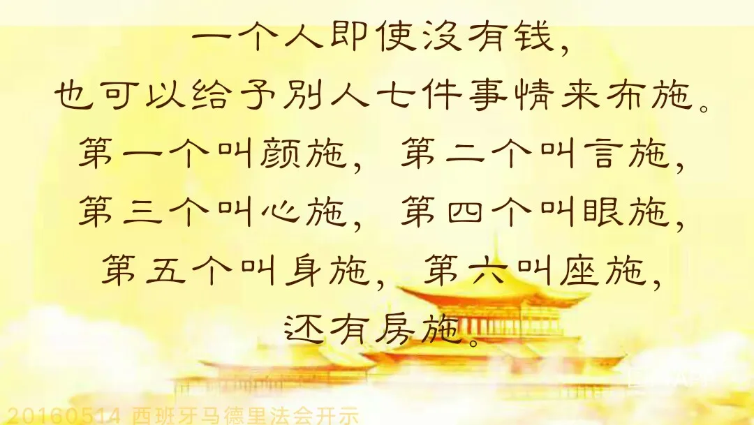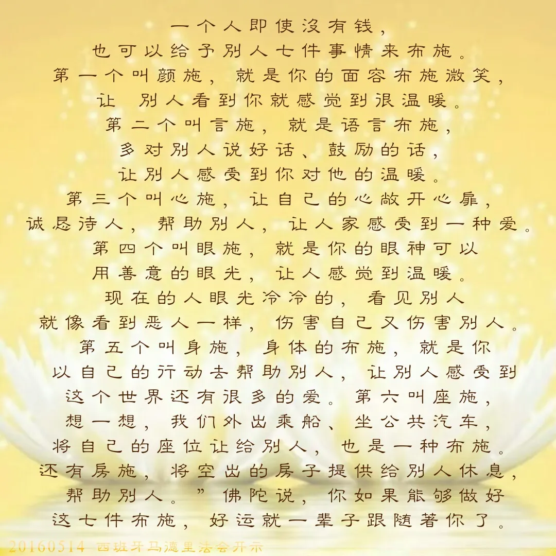 佛陀跟他讲:“一个人即使没有钱,也可以给予别人七件事情来布施。第一个叫颜施,就是你的面容布施微笑,让 别人看到你就感觉到很温暖。第二个叫言施,就是语言布施,多对别人说好话、鼓励的话,让别人感受到你对他的温暖。第三个叫心施,让自己的心敞开心扉,诚恳待人,帮助别人,让人家感受到一种爱。第四个叫眼施,就是你的眼神可以用善意的眼光,让人感觉到温暖。现在的人眼光冷冷的,看见别人就像看到恶人一样,伤害自己又伤害别人。第五个叫身施,身体的布施,就是你以自己的行动去帮助别人,让别人感受到这个世界还有很多的爱。第六叫座施,想一想,我们外出乘船、坐公共汽车,将自己的座位让给别人,也是一种布施。还有房施,将空出的房子提供给别人休息,帮助别人。”佛陀说,你如果能够做好这七件布施,好运就一辈子跟随着你了。