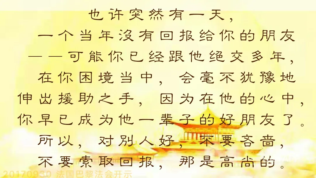 当年,无论是赵宣子还是桑下饿人,都不会想到会有日后的搭救。 在人间,有些人为别人做了一点点事情,总想着要求回报,似乎这样才觉得不吃亏,如果没有得到预想的回报,就说“人心莫测”,甚至发誓再也不与这个人为善。也许突然有一天,一个当年没有回报给你的朋友——可能你已经跟他绝交多年,在你困境当中,会毫不犹豫地伸出援助之手,因为在他的心中,你早已成为他一辈子的好朋友了。所以,对别人好,不要吝啬,不要索取回报,那是高尚的。大家知道有一句谚语,送人玫瑰,手留余香,余香留存,一生受用。送别人玫瑰花,你的手也会很香的。