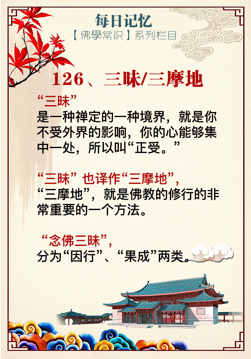 因为三昧,它会变成“因行”和“果成”两类,那么“因行”是什么呢?“念佛三昧”就是指:一心一意看着佛像的相,很好,相好庄严,佛像非常好。然后呢,一心念佛的名字,称为名念佛,所以“因行”,因为的“因”,行动的“行”。“果成”的是什么呢,“果成”是念佛三昧,是什么意思,因为你的心啊,入了禅定了,因为你观着菩萨的那个相啊,实际上在你心中,就把佛像进入你的内心当中,你的心就会禅定,就定得下来。