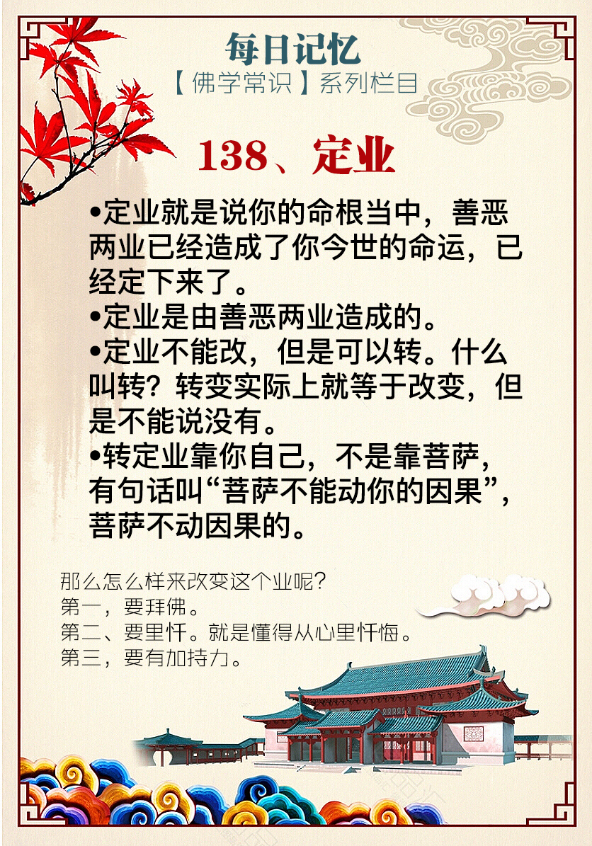 问1:舍法谤法、出佛身血、说大妄语、杀生害命等等通常都是定业,一般会经过多劫的报应来偿还,果报十分严重;其它大部分的罪过多属不定业,通过学佛并如理如法的忏悔修行等行动都可以转变,但定业就转变不了。请问师父我们念小房子可以消除定业吗?