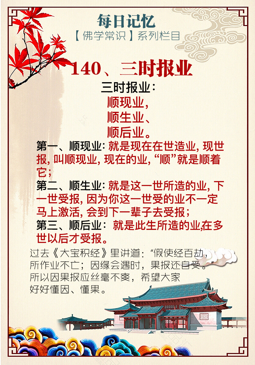 这个世界上有的就是三时报业,叫顺现业,还有顺生业、顺后业。就是现在在世造业,现世报,叫顺现业,现在的业,“顺”就是顺着它;第二,顺生业,就是这一世所造的业,下一世受报,因为你这一世受的业不一定马上激活,会到下一辈子去受报;第三叫顺后业,就是此生所造的业,在多世以后才受报。过去《大宝积经》里讲道:“假使经百劫,所作业不亡;因缘会遇时,果报还自受。”所以因果报应丝毫不爽,希望大家好好懂因、懂果。