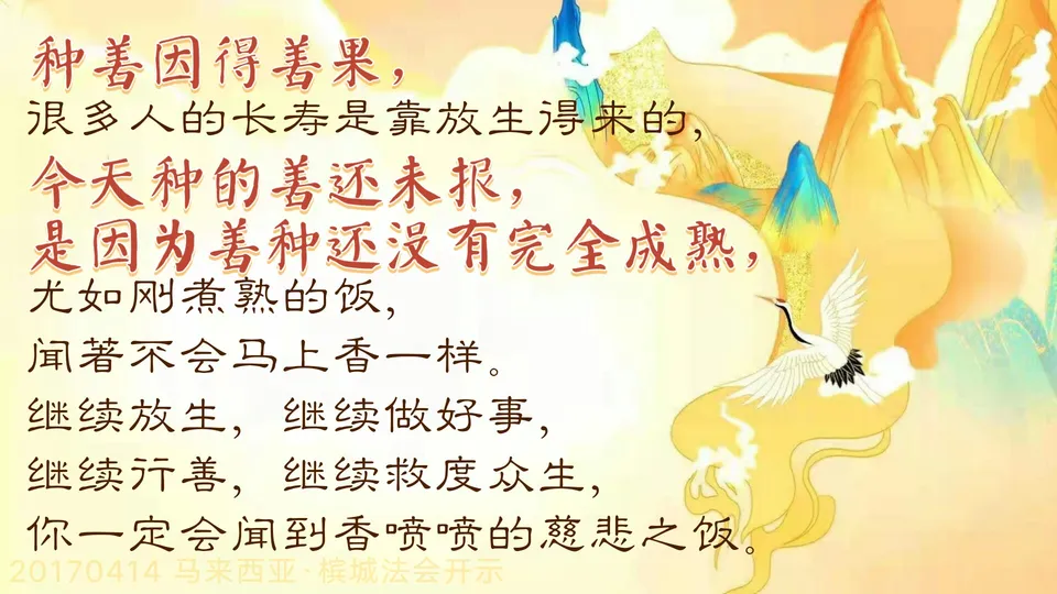 希望你们多放生,也会把你们领回来。种善因得善果,很多人的长寿是靠放生得来的,今天种的善还未报,是因为善种还没有完全成熟尤如刚煮熟的饭,闻着不会马上香一样。继续放生,继续做好事,继续行善,继续救度众生,你一定会闻到香喷喷的慈悲之饭。