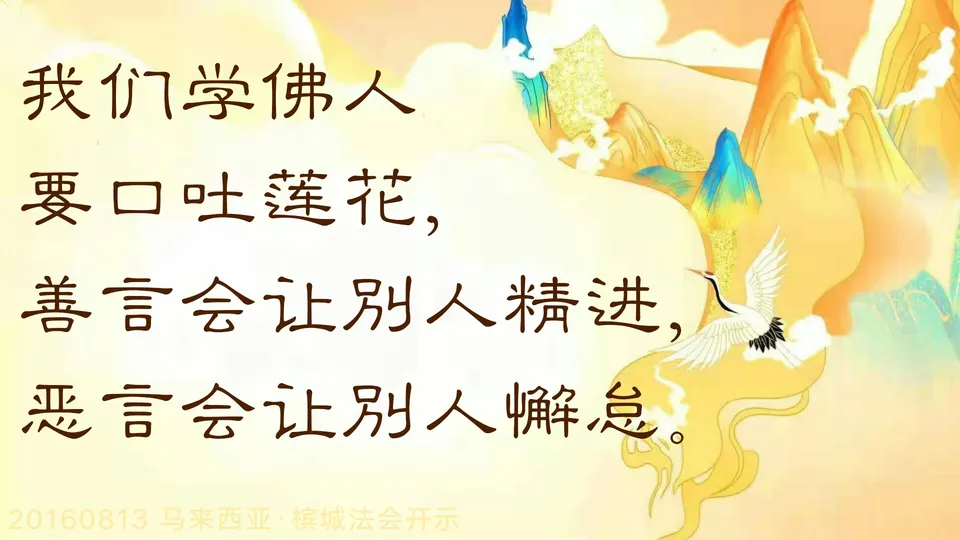 这个故事告诉我们,我们学佛人要口吐莲花,善言会让别人精进,恶言会让别人懈怠。想让自己欢喜,就要让众生欢喜;想让自己幸福,就要让众生幸福;想解决人间的烦恼,用的是慈悲;想要脱离人间苦难,用的是佛法的智慧。