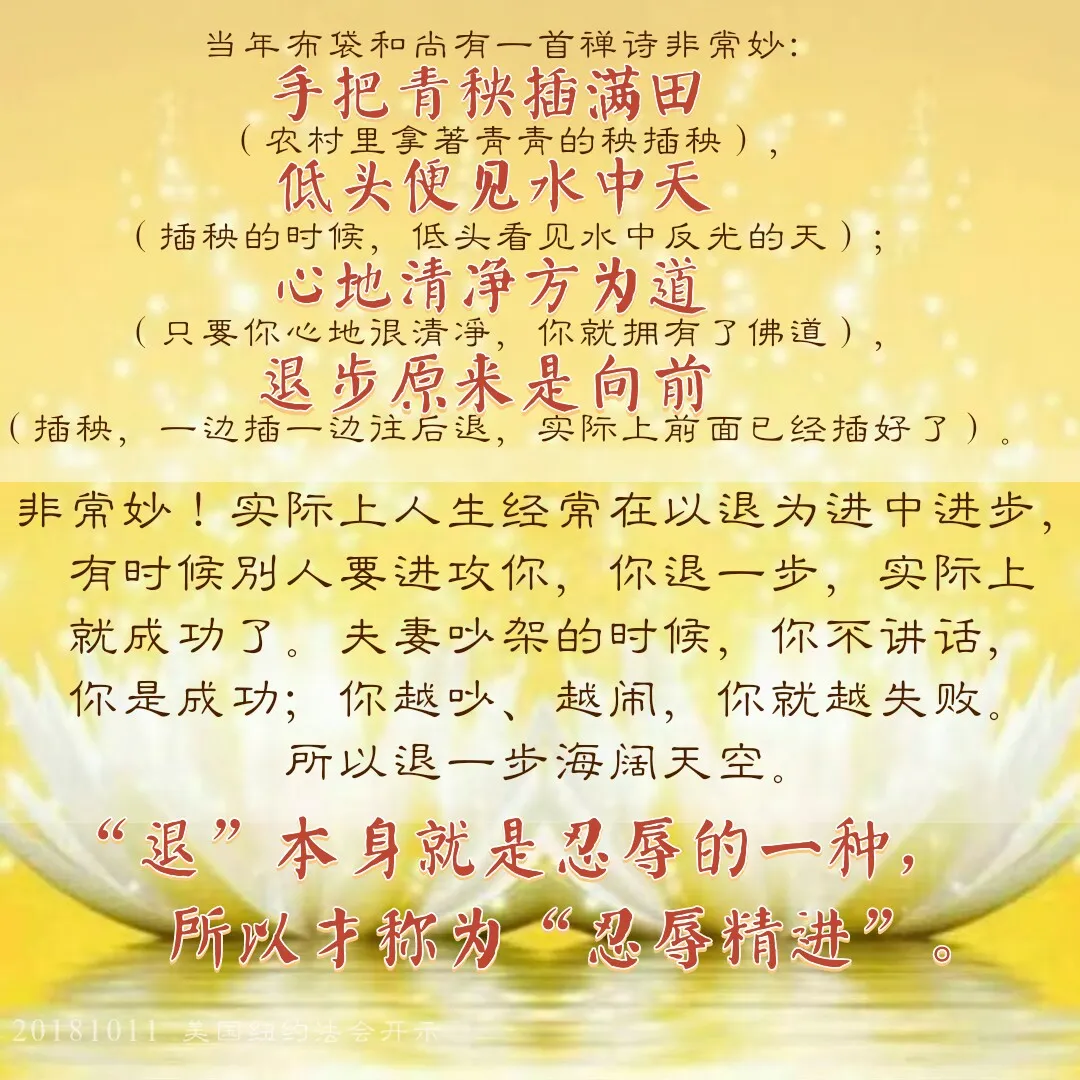 非常妙!实际上人生经常在以退为进中进步,有时候别人要进攻你,你退一步,实际上就成功了。夫妻吵架的时候,你不讲话,你是成功;你越吵、越闹,你就越失败。所以退一步海阔天空。“退”本身就是忍辱的一种,所以才称为“忍辱精进”。