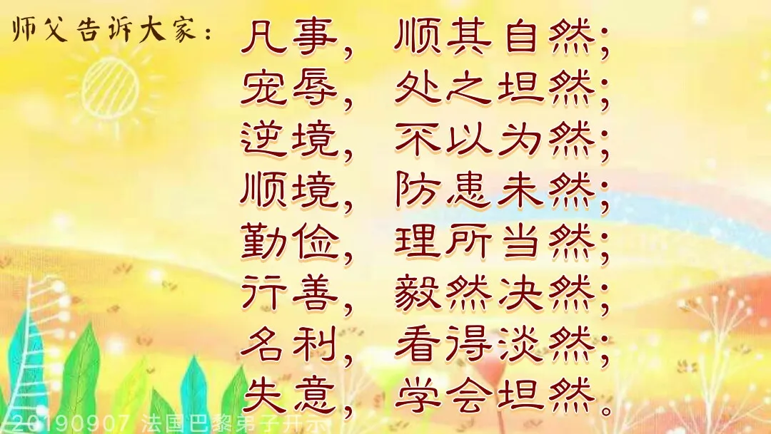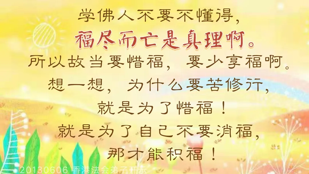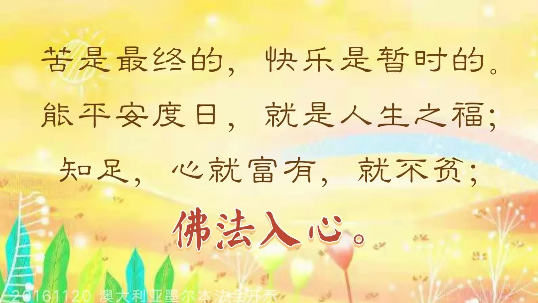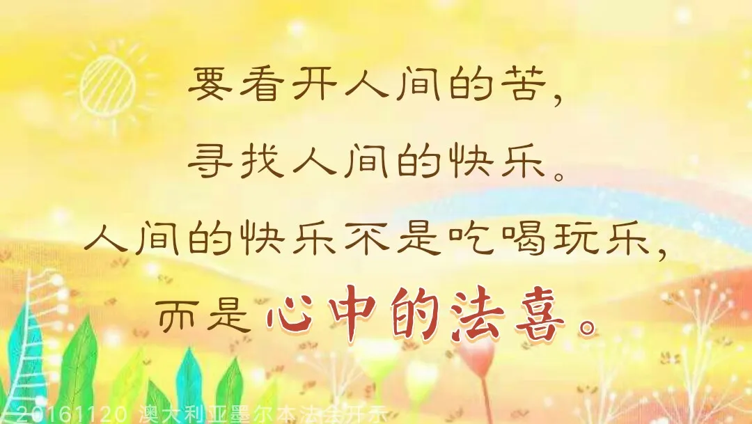 要看开人间的苦,寻找人间的快乐。人间的快乐不是吃喝玩乐,而是心中的法喜。今天送你一辆车,今天给你一个房子,也会失去,但是心中有一个自己的愿望,比方说“我的孩子一定要考上精英中学”,很多西人说“圣诞节到了,我要有一个长假期”,这个时候,他11 月份很快乐,12 月份很快乐,1 月份也很快乐,是看不见的喜悦,但是到二月份又开始痛苦了,因为假期结束了。苦是最终的,快乐是暂时的。能平安度日,就是人生之福;知足,心就富有,就不贫;佛法入心。