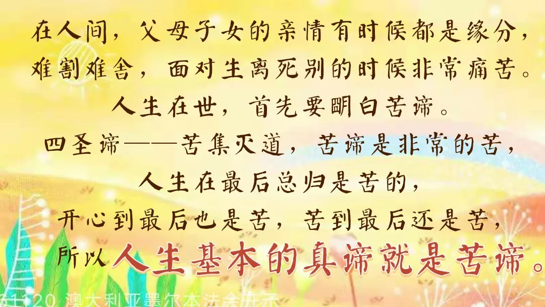 在人间,父母子女的亲情有时候都是缘分,难割难舍,面对生离死别的时候非常痛苦。人生在世,首先要明白苦谛。四圣谛——苦集灭道,苦谛是非常的苦,人生在最后总归是苦的,开心到最后也是苦,苦到最后还是苦,所以人生基本的真谛就是苦谛。
