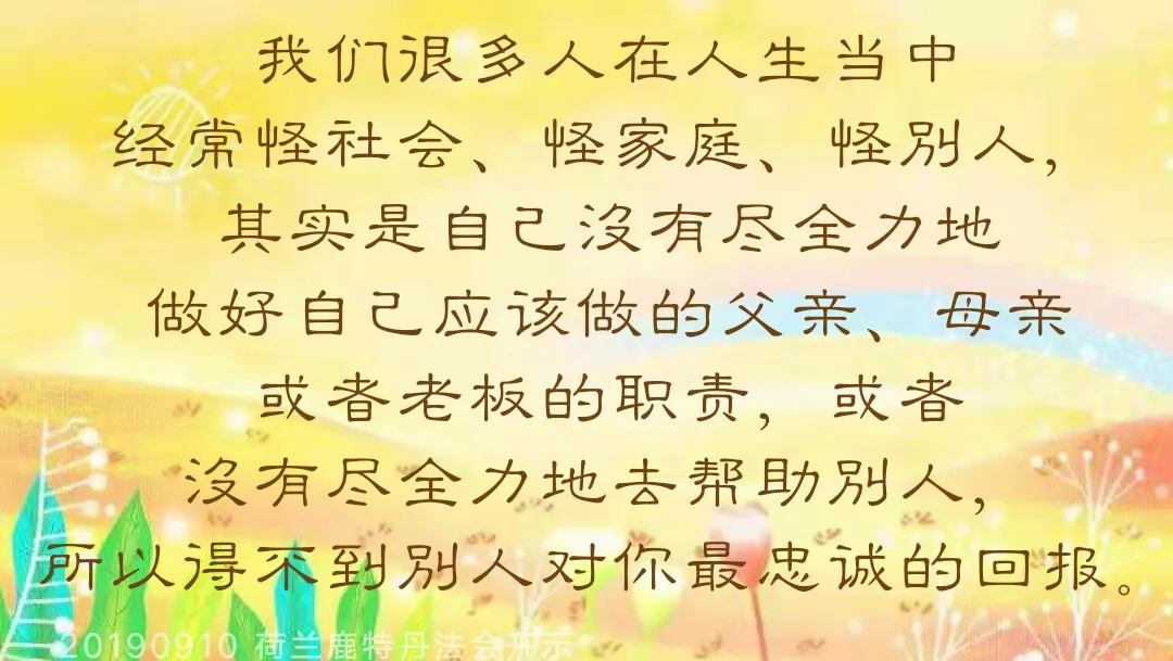 我们很多人在人生当中经常怪社会、怪家庭、怪别人,其实是自己没有尽全力地做好自己应该做的父亲、母亲或者老板的职责,或者没有尽全力地去帮助别人,所以得不到别人对你最忠诚的回报。