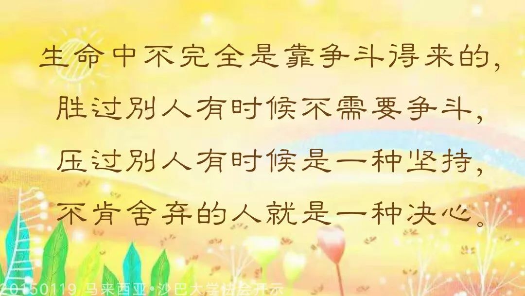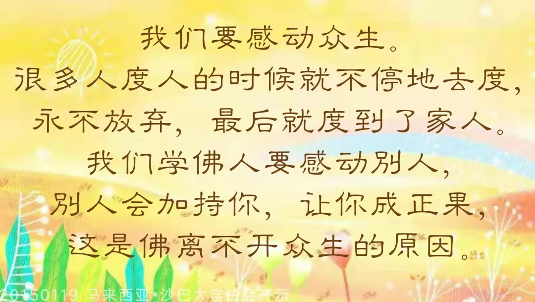 生命中不完全是靠争斗得来的,胜过别人有时候不需要争斗,压过别人有时候是一种坚持,不肯舍弃的人就是一种决心,我们要感动众生。很多人度人的时候就不停地去度,永不放弃,最后就度到了家人。这个故事中我们看到了那么多不愿意出价的善良人做了感动众生的事情,我们学佛人要感动别人,别人会加持你,让你成正果,这是佛离不开众生的原因。