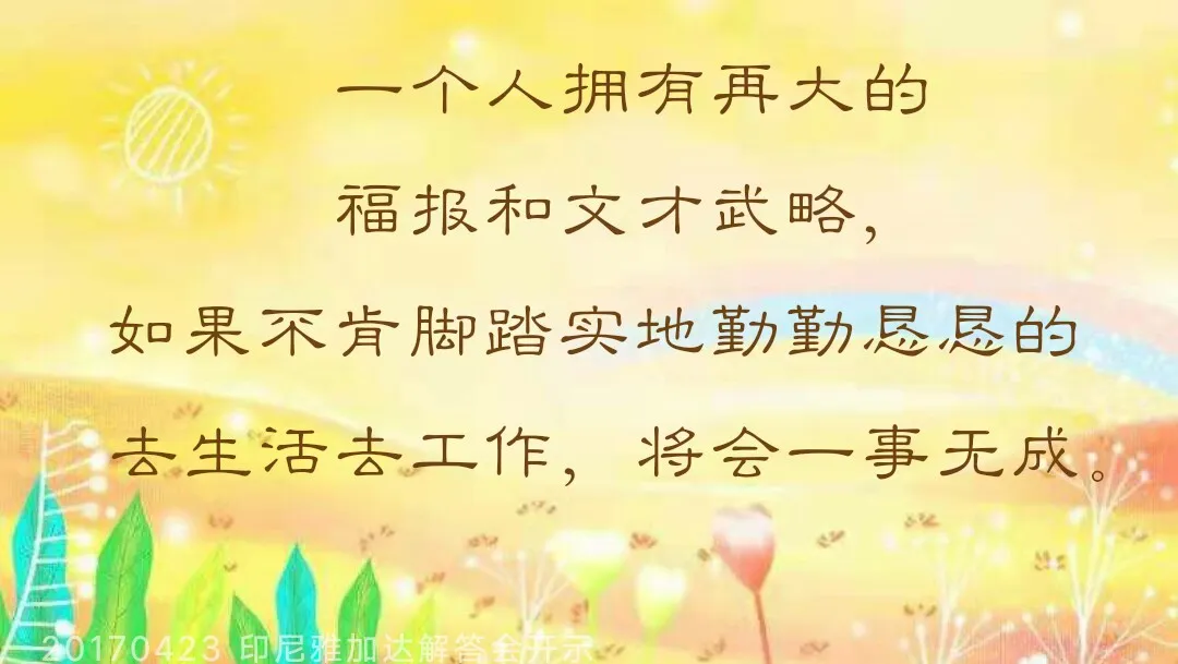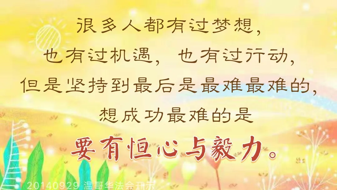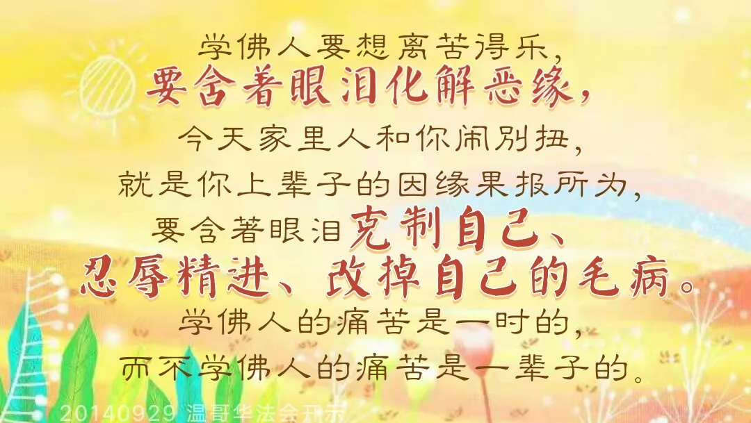 很多人都有过梦想,也有过机遇,也有过行动,但是坚持到最后是最难最难的,想成功最难的是要有恒心与毅力学佛人要想离苦得乐,要含着眼泪化解恶缘,今天家里人和你闹别扭,就是你上辈子的因缘果报所为,要含着眼泪克制自己、忍辱精进、改掉自己的毛病。学佛人的痛苦是一时的,而不学佛人的痛苦是一辈子的。