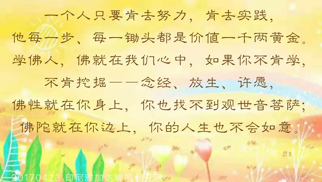 另一个含义是,一个人只要肯去努力,肯去实践,他每一步、每一锄头都是价值一千两黄金。学佛人,佛就在我们心中,如果你不肯学,不肯挖掘——念经、放生、许愿,佛性就在你身上,你也找不到观世音菩萨;佛陀就在你边上,你的人生也不会如意。
