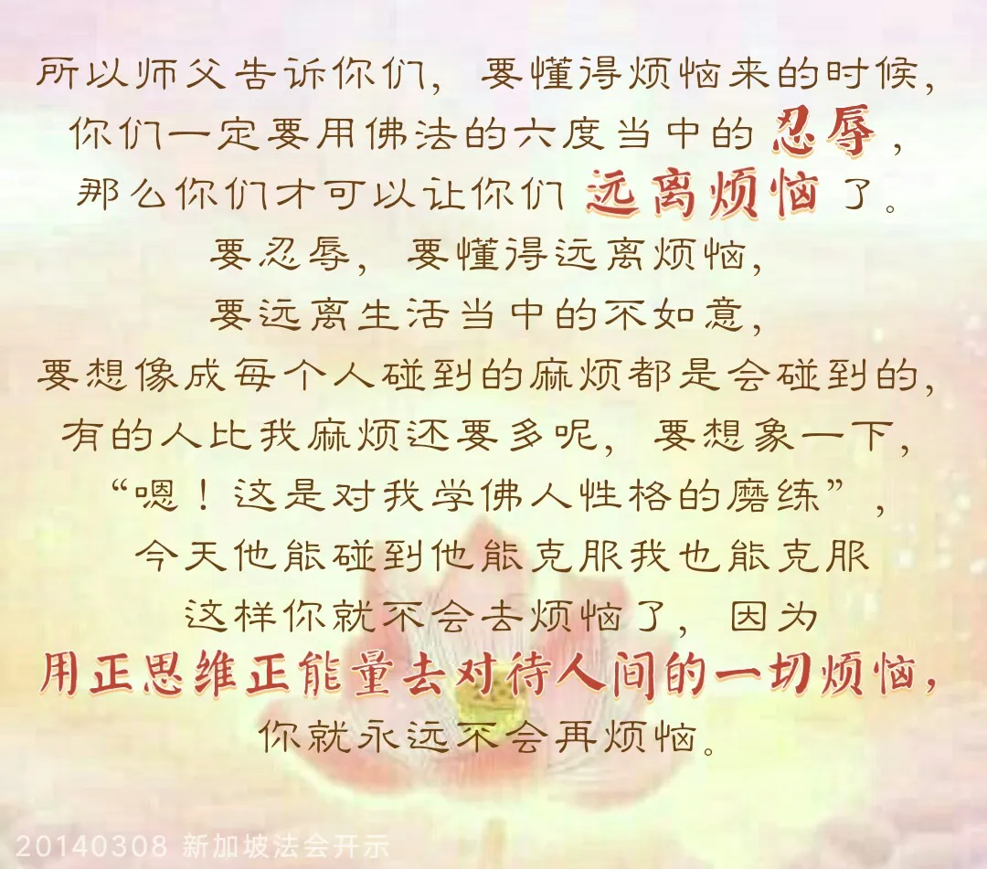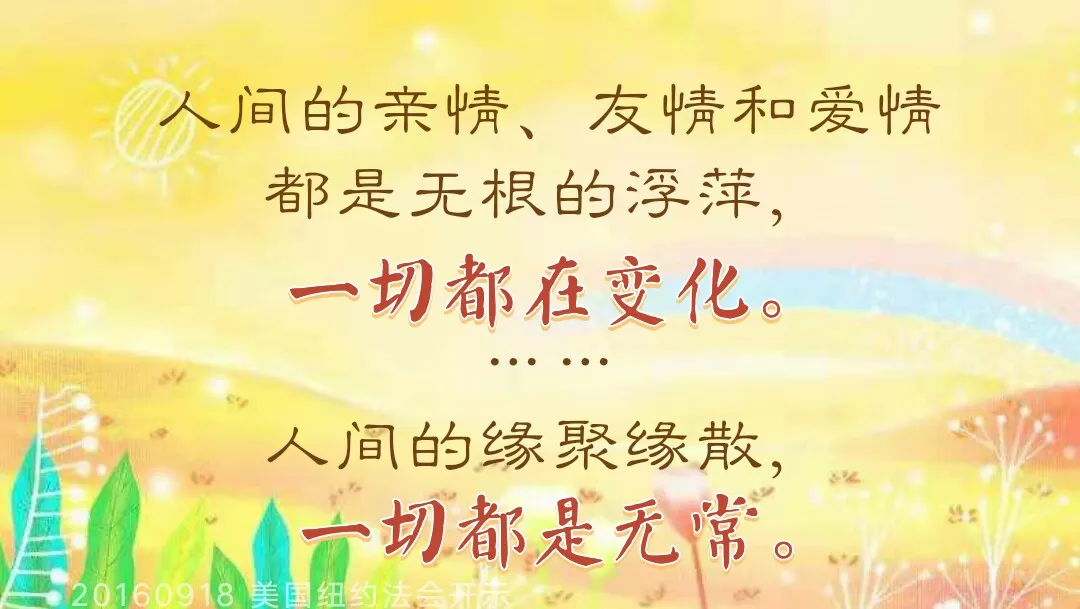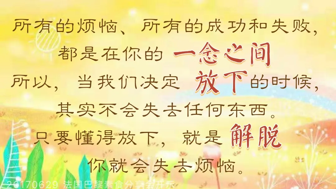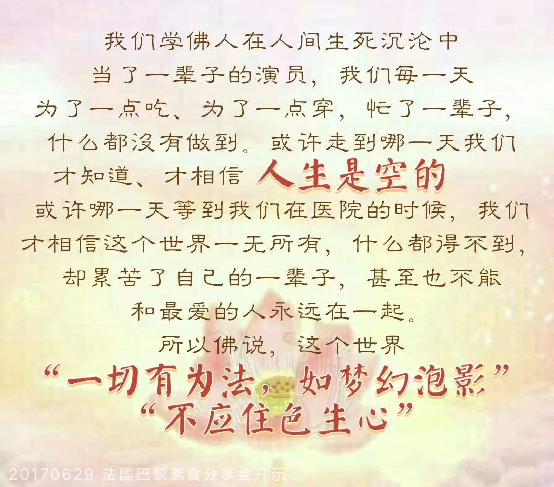 所有的烦恼、所有的成功和失败,都是在你的一念之间。所以,当我们决定放下的时候,其实不会失去任何东西。只要懂得放下,就是解脱,你就会失去烦恼。(所以)我们学佛人在人间生死沉沦中当了一辈子的演员,我们每一天为了一点吃、为了一点穿,忙了一辈子,什么都没有做到。或许走到哪一天我们才知道、才相信人生是空的;或许哪一天等到我们在医院的时候,我们才相信这个世界一无所有,什么都得不到,却累苦了自己的一辈子,甚至也不能和最爱的人永远在一起。所以佛说,这个世界“一切有为法,如梦幻泡影”“不应住色生心”,佛陀就是让我们不能关注自己在这个世界上得到的一切和自己喜欢看到的一切,而生这种心——贪心出来。所以“不应住色声香味触法而生其心”,一个人“应无所住而生其心”。