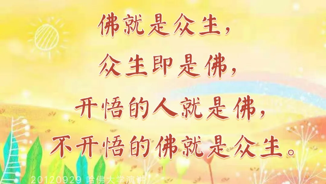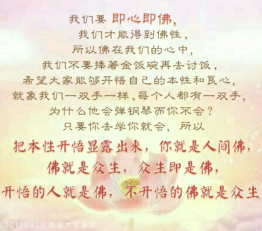 我们要即心即佛,我们才能得到佛性, 所以佛在我们的心中,我们不要捧着金饭碗再去讨饭, 希望大家能够开悟自己的本性和良心,就象我们一双手一样,每个人都有一双手,为什么他会弹钢琴而你不会?只要你去学你就会,所以把本性开悟显露出来,你就是人间佛,佛就是众生,众生即是佛,开悟的人就是佛,不开悟的佛就是众生。