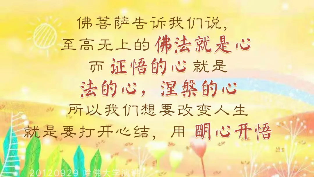 所以希望大家要明白,我们学佛不要去找气生,因为吵架的人以为自己都是对的,才会吵架。如果有一个人觉得自己不对,他就不会吵架。所以佛菩萨告诉我们说,至高无上的佛法就是心,而证悟的心就是法的心,涅槃的心,所以我们想要改变人生就是要打开心结,用明心开悟。