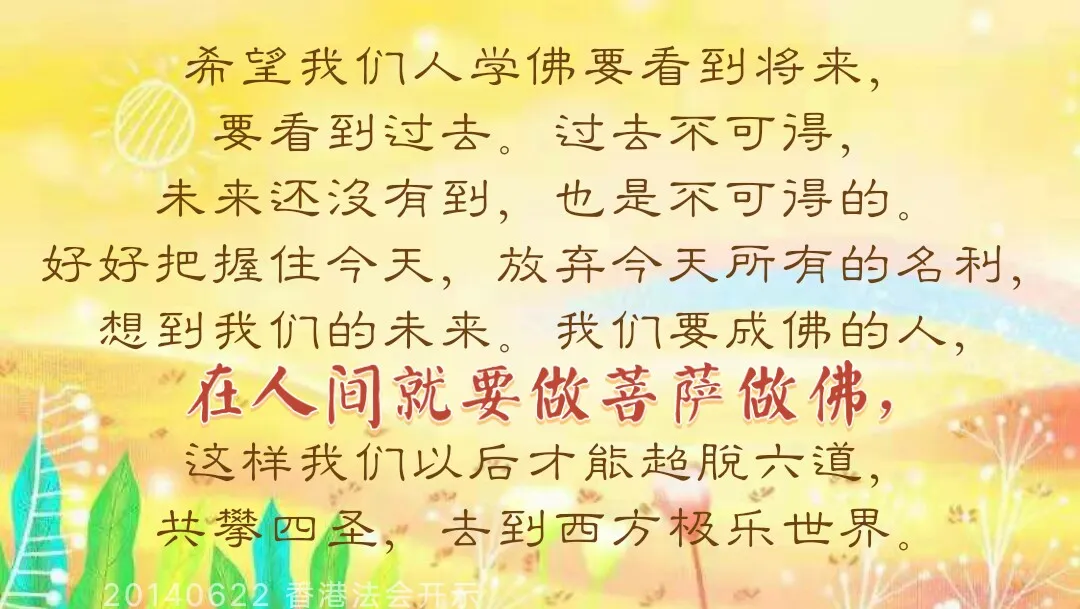 所以希望我们人学佛要看到将来,要看到过去。过去不可得,未来还没有到,也是不可得的。好好把握住今天,放弃今天所有的名利,想到我们的未来。我们要成佛的人,在人间就要做菩萨做佛,这样我们以后才能超脱六道,共攀四圣,去到西方极乐世界。