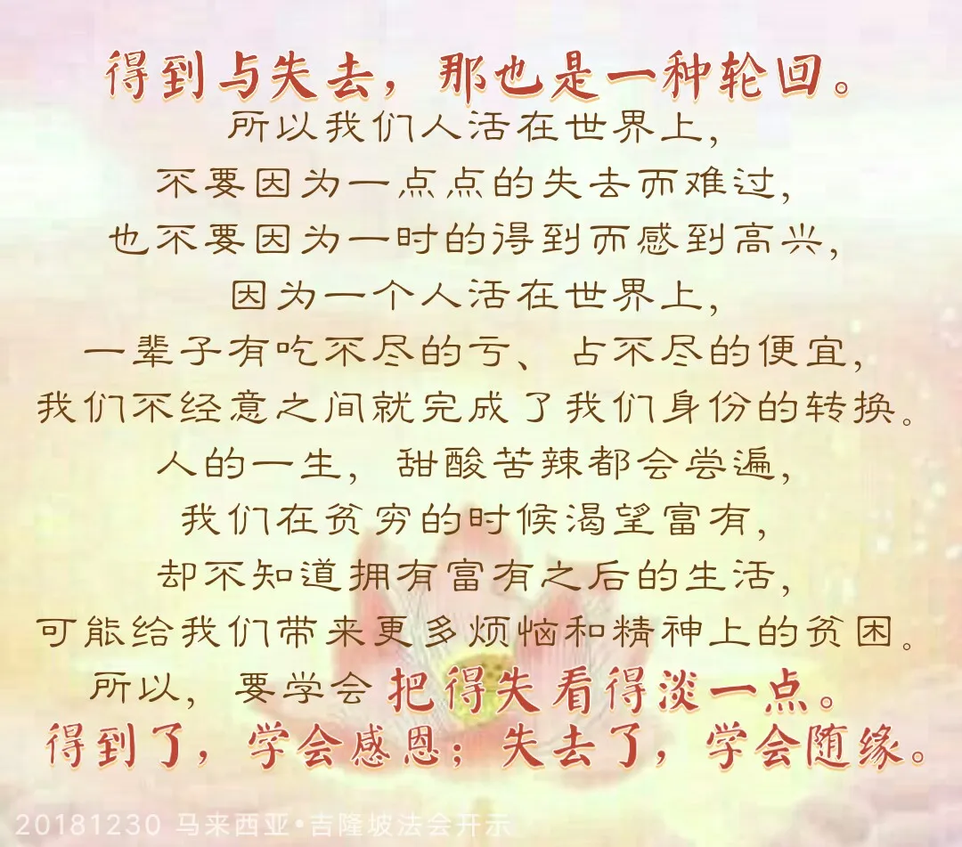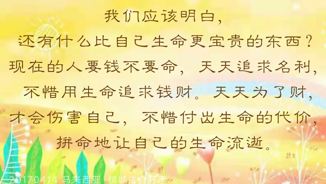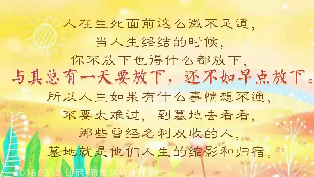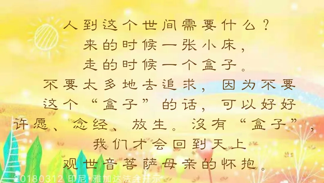 人到这个世间需要什么?来的时候一张小床,走的时候一个盒子。不要太多地去追求,因为不要这个“盒子”的话,可以好好许愿、念经、放生。没有“盒子”,我们才会回到天上观世音菩萨母亲的怀抱。