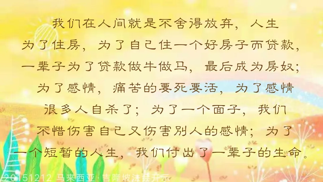 我们在人间就是不舍得放弃人生为了住房,为了自己住一个好房子而贷款,一辈子为了贷款做牛做马,最后成为房奴;为了感情,痛苦的要死要活,为了感情很多人自杀了;为了一个面子,我们不惜伤害自己又伤害别人的感情;为了一个短暂的人生,我们付出了一辈子的生命。