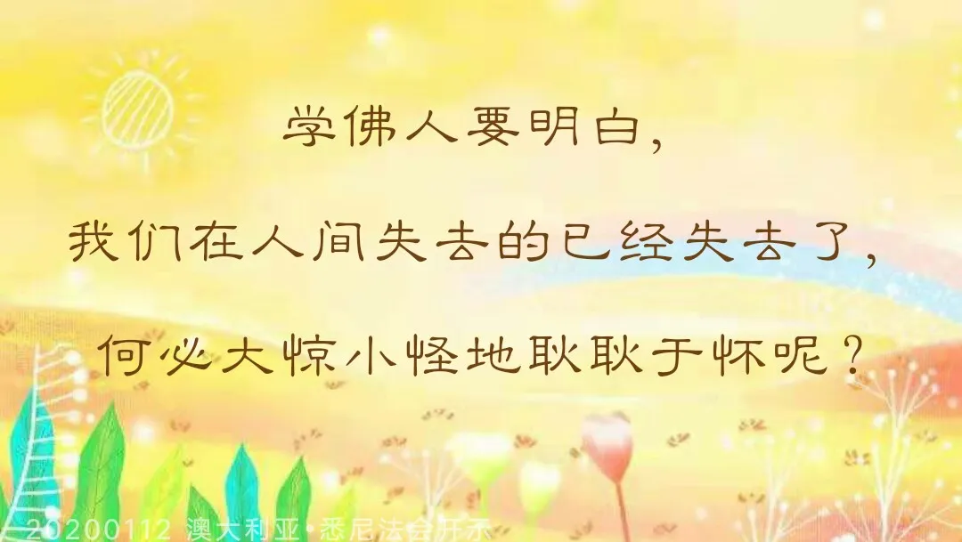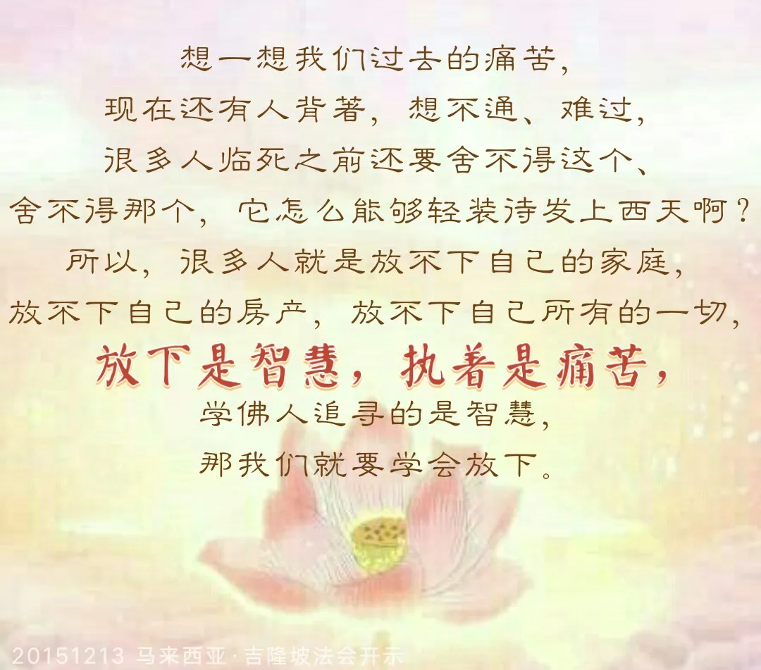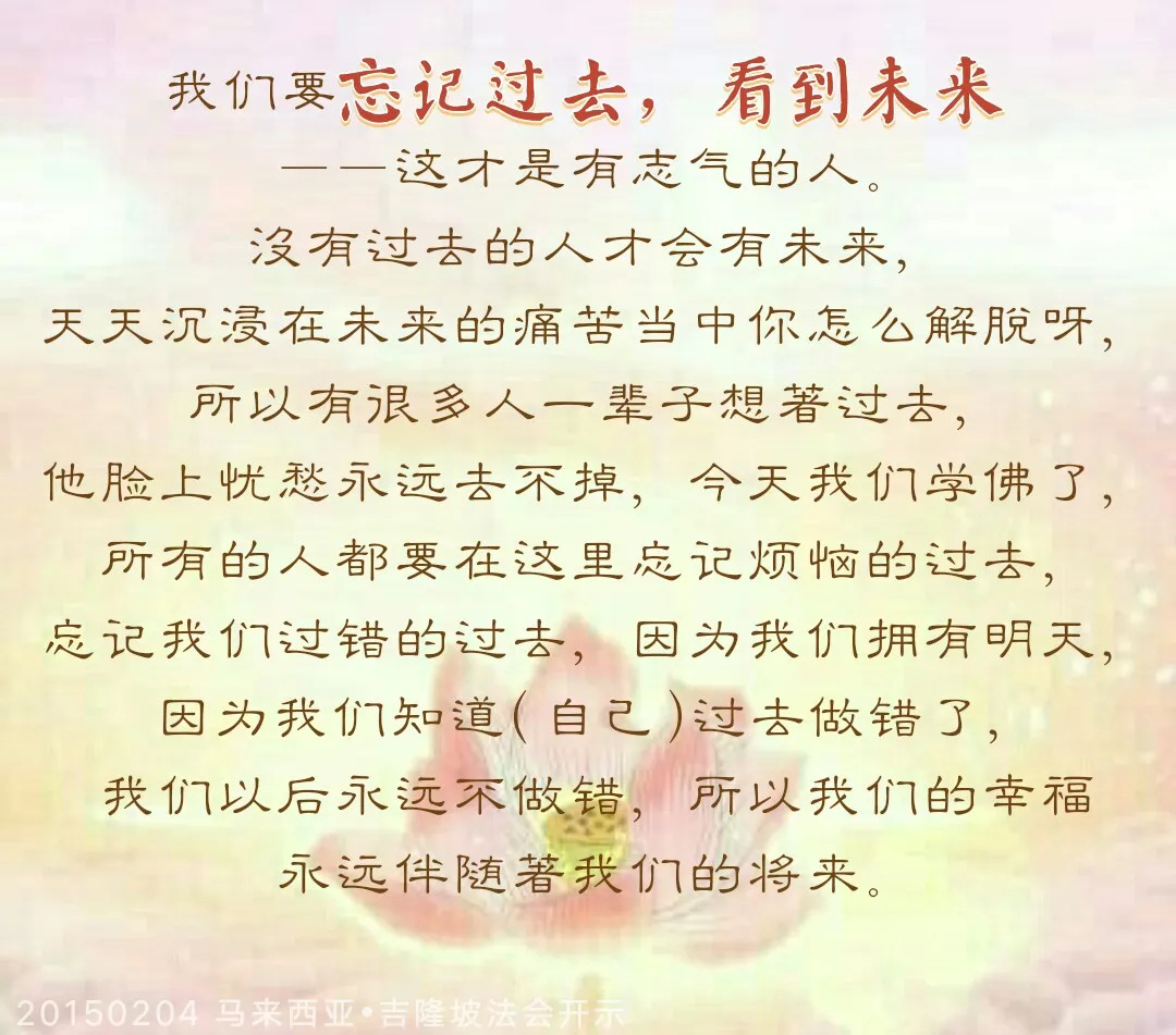 我们要忘记过去,看到未来——这才是有志气的人。没有过去的人才会有未来,天天沉浸在未来的痛苦当中你怎么解脱呀,所以有很多人一辈子想着过去,他脸上忧愁永远去不掉,今天我们学佛了,所有的人都要在这里忘记烦恼的过去,忘记我们过错的过去,因为我们拥有明天,因为我们知道(自己)过去做错了,我们以后永远不做错,所以我们的幸福永远伴随着我们的将来。