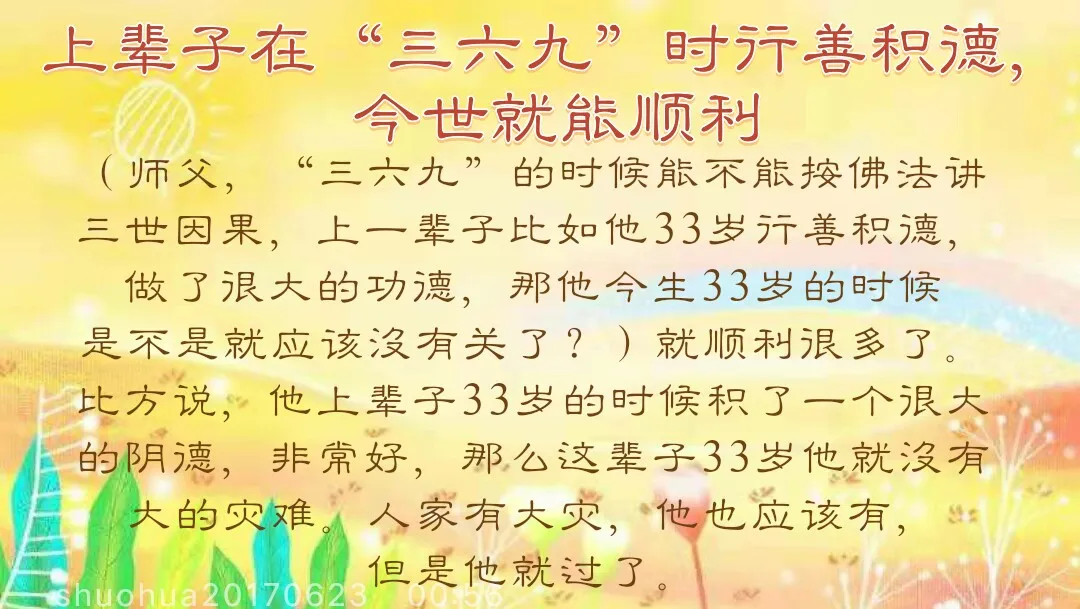 台长答:其实影响最大的还是“三六九”,因为人的劫数不断,所以说“千劫难遇,百万劫难逢”,就是说一个人的一生有不断的劫。你想一想,你小时候摔一跤,差点把眼睛摔瞎了;或者脚扭一下,说不定一生就残废了。这些都是劫(对对)大劫小劫,千劫万劫,所以一个人的劫数不断。刚刚好了又倒霉了,倒霉了又开始好了,就是不停地在劫当中前进,就像现在我们走路一样,一会儿绊一跤,一会儿找不到路,就是在这种劫数当中,我们在进步,我们在往前进。所以“三六九”是避不开的,每个人都避不开的(师父,“三六九”是一个定数吗?)对。人的命当中的“三六九”相当于人家说“73、84,人一定要走掉”一样(师父,“三六九”的时候能不能按佛法讲三世因果,上一辈子,比如他33岁行善积德,做了很大的功德,那他今生33岁的时候是不是就应该没有关了?)就顺利很多了。比方说,他上辈子33岁的时候积了一个很大的阴德,非常好,那么这辈子33岁他就没有大的灾难。人家有大灾,他也应该有,但是他就过了。