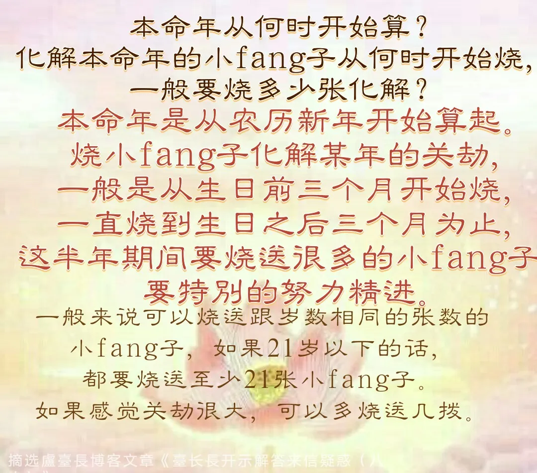 薹長答:本命年是从农历新年开始算起。烧小fang子化解某年的关劫,一般是从生日前三个月开始烧,一直烧到生日之后三个月为止,这半年期间要烧送很多的小fang子,要特别的努力精进。一般来说可以烧送跟岁数相同的张数的小fang子,如果21岁以下的话,都要烧送至少21张小fang子。如果感觉关劫很大,可以多烧送几拨。