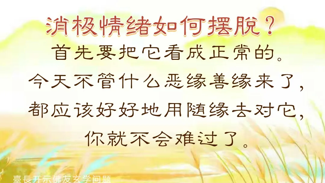 问5:修行人应该放下小我,但是“我”却经常跑出来,一会不高兴了,一会不平衡了,心烦意燥,虽然每天念功课和小fang子不断,但是这种消极情绪在本命年出现地很频繁,请问这是不是和本命年的劫有关,学佛人应该怎样摆脱这样的消极情绪?