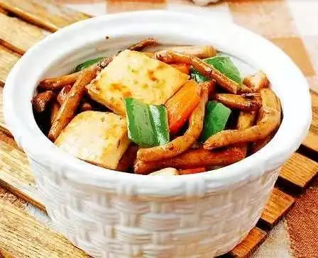 4.先放入茶树菇,再放入青椒、胡萝卜与豆腐一起拌炒均匀。
