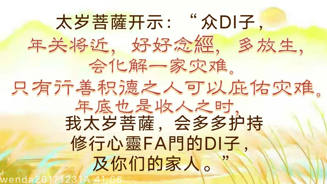 男听众:太岁菩薩开.示:“众DI子,年关将近,好好念經,多放.生,会化解一家灾难。年底也是收人之时,只有行善积德之人可以庇佑灾难。我太岁菩薩,会多多护持修行心靈FA門的DI子,及你们的家人。”因为这个同.修挺担心家人的,太岁菩薩就对他开.示了几句。師父,DI子想问,太岁菩薩开.示我们要好好念经,多放.生,会化解一家灾难。具体是不是指的我们念的消灾吉祥神咒在放生时候也可以祈求化解灾难呢?