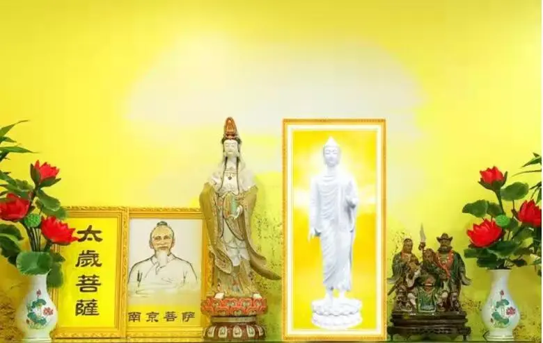 面对佛台七尊菩萨自左至右依次为:太岁菩萨、南京菩萨、观世音菩萨、释迦牟尼佛、关平菩萨、关帝菩萨、周仓菩萨。其中观世音菩萨与释迦牟尼佛并排放在中间(佛台背景画的光环在两尊菩萨的中间)。