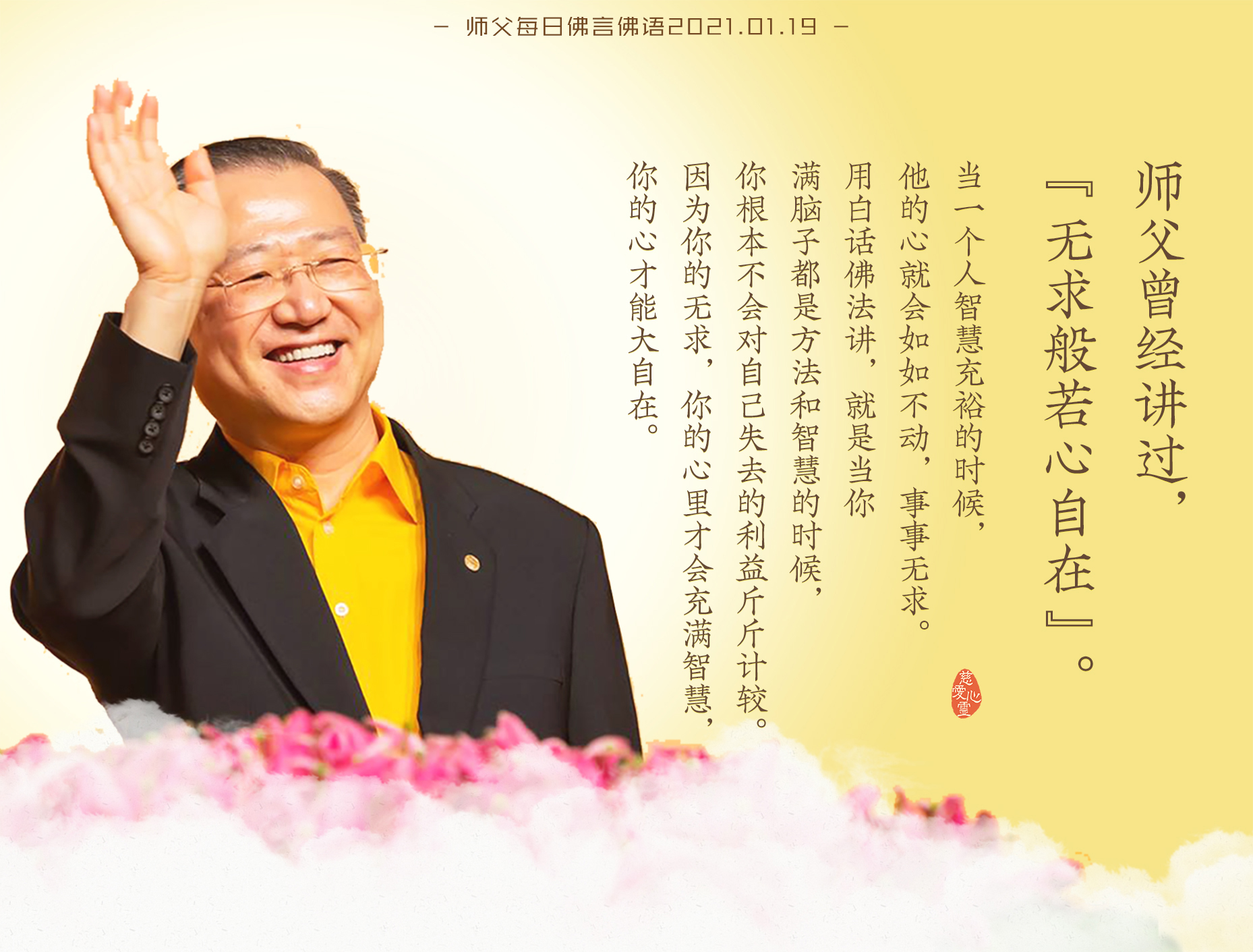 当一个人智慧充裕的时候,他的心就会如如不动,事事无求。用白话佛法讲,就是当你满脑子都是方法和智慧的时候,你根本不会对自己失去的利益斤斤计较。因为你的无求,你的心里才会充满智慧,你的心才能大自在。就犹如一个手,手掌可以做任何事情,手背就做不了什么事情;手掌就是你的智慧,而当你没有智慧时,就犹如用手背在做事一样,不能让智慧在你心中得到自在。