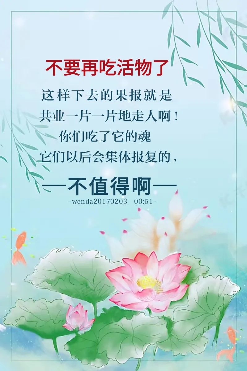 不要再吃活物了,这样下去的果报就是共业一片一片地走人啊。你们吃了它的魂,它们以后会集体报复的,不值得啊。