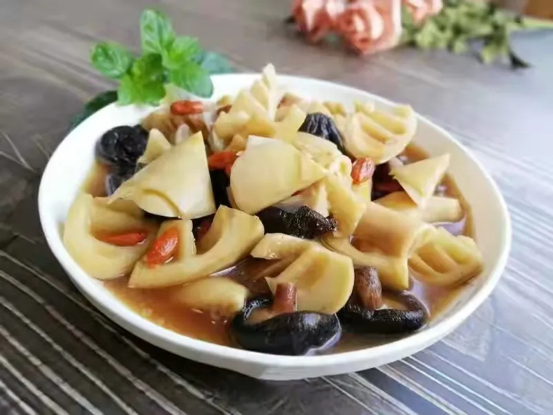 3. 加入冬笋、枸杞同煮5分钟,加水淀粉勾薄芡,鲜美脆嫩的鲜笋遇冬菇出锅啦。