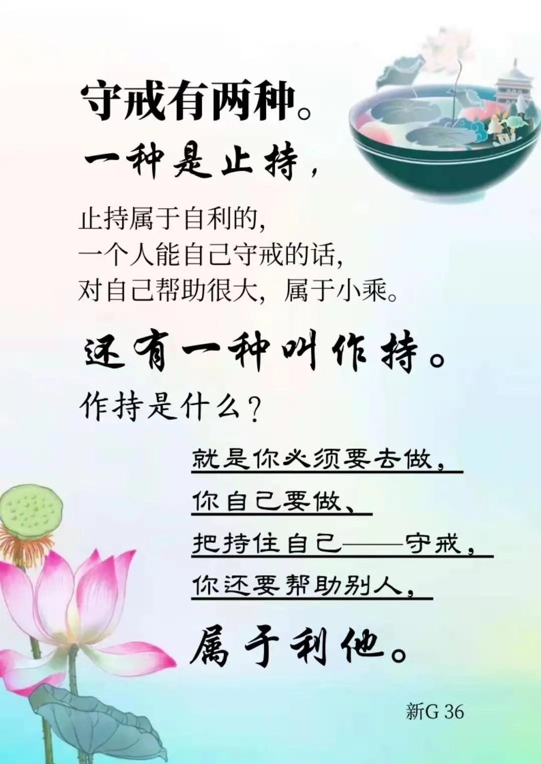 首先跟你们讲,任何一个人持戒很重要的。守 戒有两种。一种是止持,止持属于自利的,一个人能自己守 戒的话,对自己帮助很大,属于小乘。
