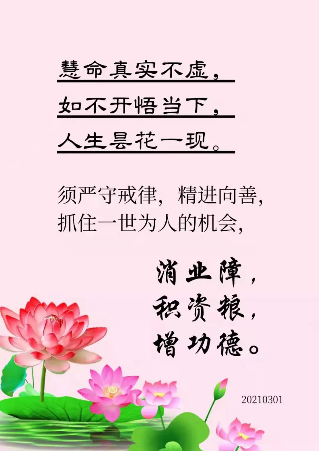 慧命真实不虚,如不开悟当下,人生昙花一现。须严守戒 律,精进向善,抓住一世为人的机会,消 业 障,积资粮,增功 德。