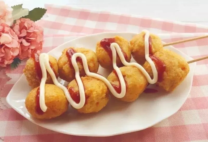 6.丸子变成金黄色即可出锅,挤上沙拉酱。