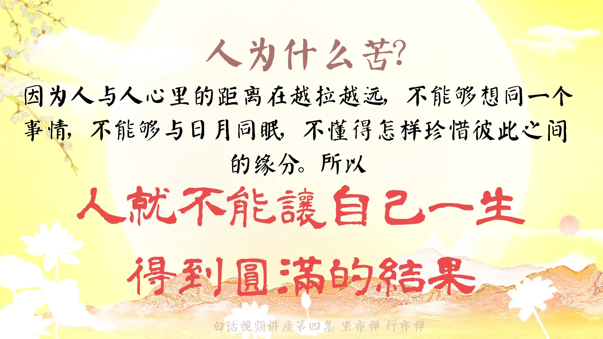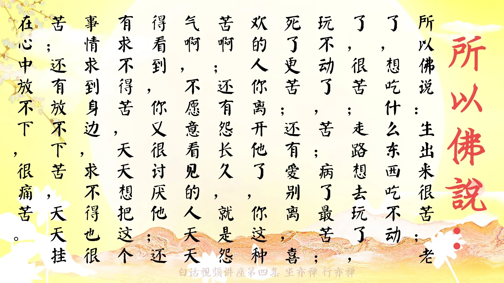 所以佛说:生出来很苦;老了,想吃什么东西吃不动了,很苦;走路想去玩了,玩不动了,苦;病了最苦;死了更苦;还有爱别离,喜欢的人你离开他了,你这种苦啊;还有怨长久,就是怨气啊,不愿意看见的人天天得看到,你又很讨厌他;还有求不得苦,天天想把这个事情求到身边,求不得也很苦;还有放不下苦,天天挂在心中放不下,很痛苦。