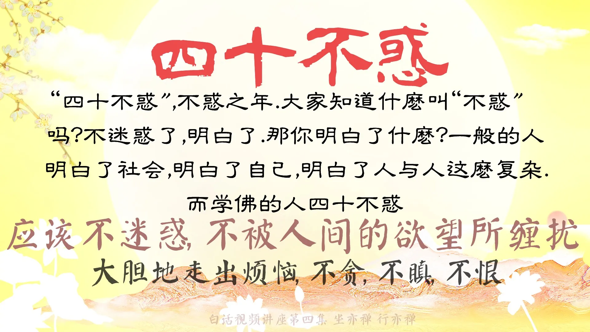 “四十不惑”,不惑之年。大家知道什么叫“不惑”吗?不迷惑了,明白了。那你明白了什么?一般的人明白了社会,明白了自己,明白了人与人这么复杂。而学佛的人四十不惑,应该不迷惑,不被人间的欲望所缠扰,大胆地走出烦恼,不贪,不瞋,不恨。