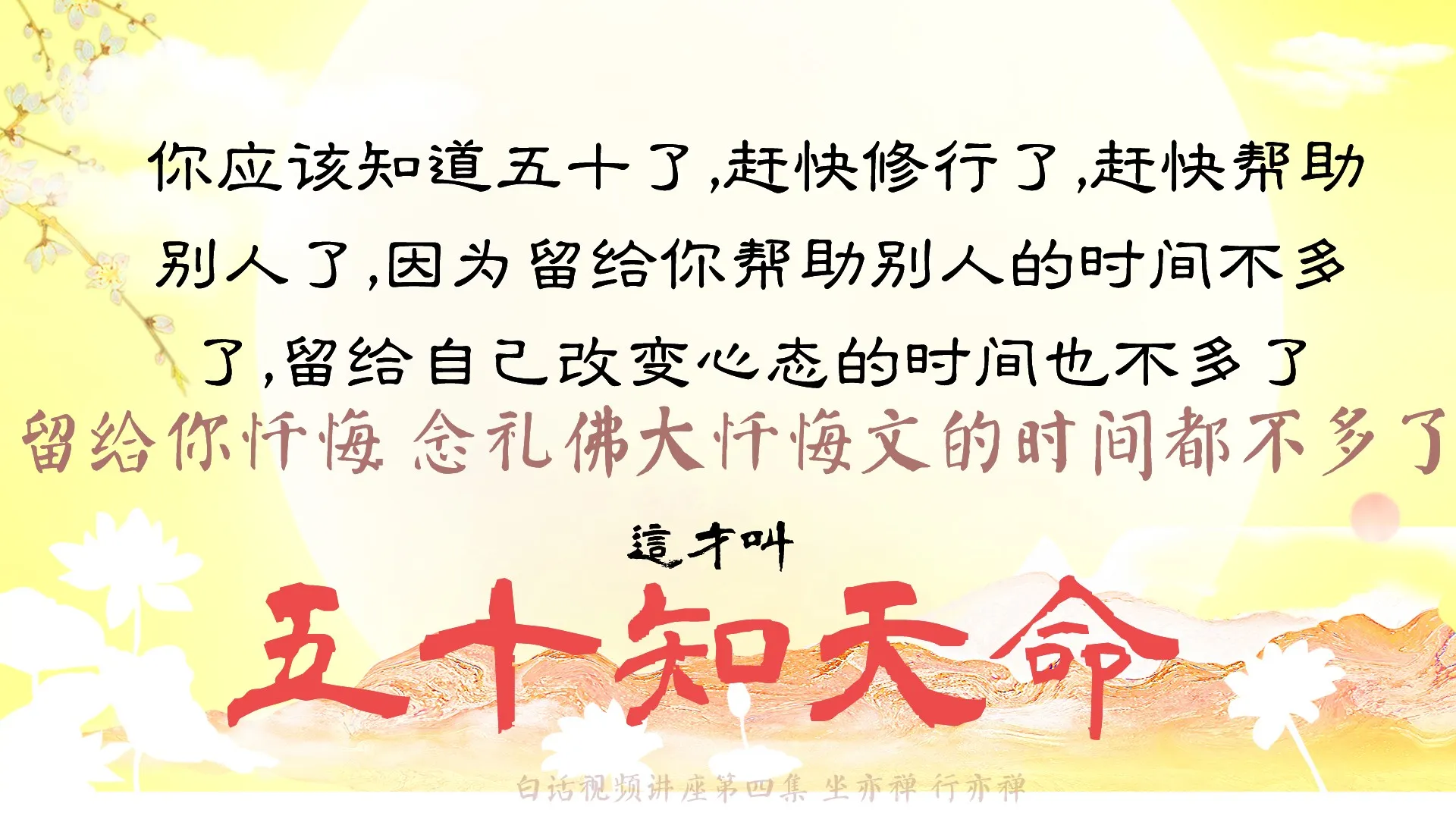 你应该知道五十了,赶快修行了,赶快帮助别人了,因为留给你帮助别人的时间不多了,留给自己改变心态的时间也不多了,留给你忏悔、念礼佛大忏悔文的时间都不多了,这才叫五十知天命。