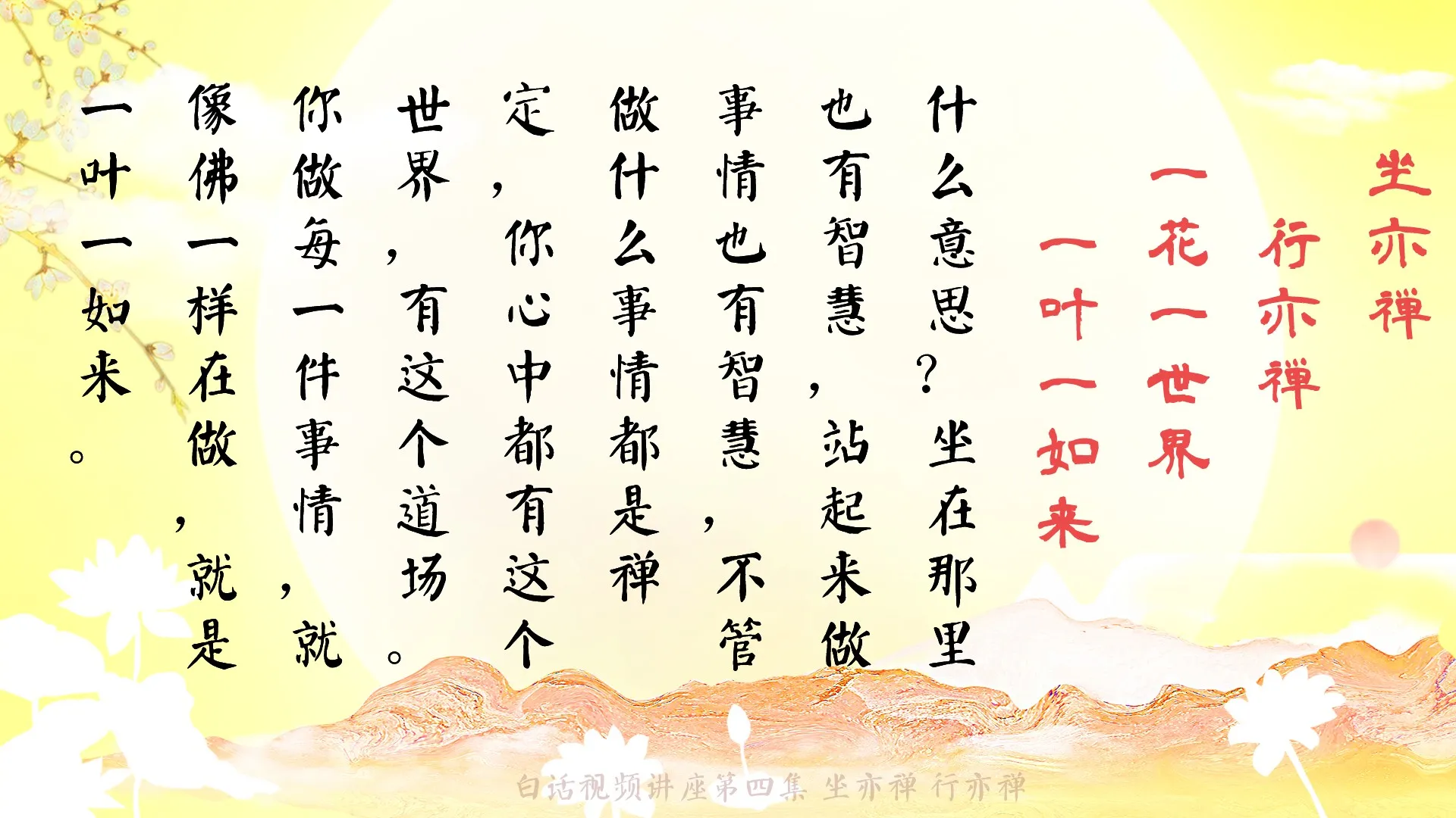 坐亦禅,行亦禅,一花一世界,一叶一如来。什么意思?坐在那里也有智慧,站起来做事情也有智慧,不管做什么事情都是禅定,你心中都有这个世界,有这个道场。你做每一件事情,就像佛一样在做,就是一叶一如来。
