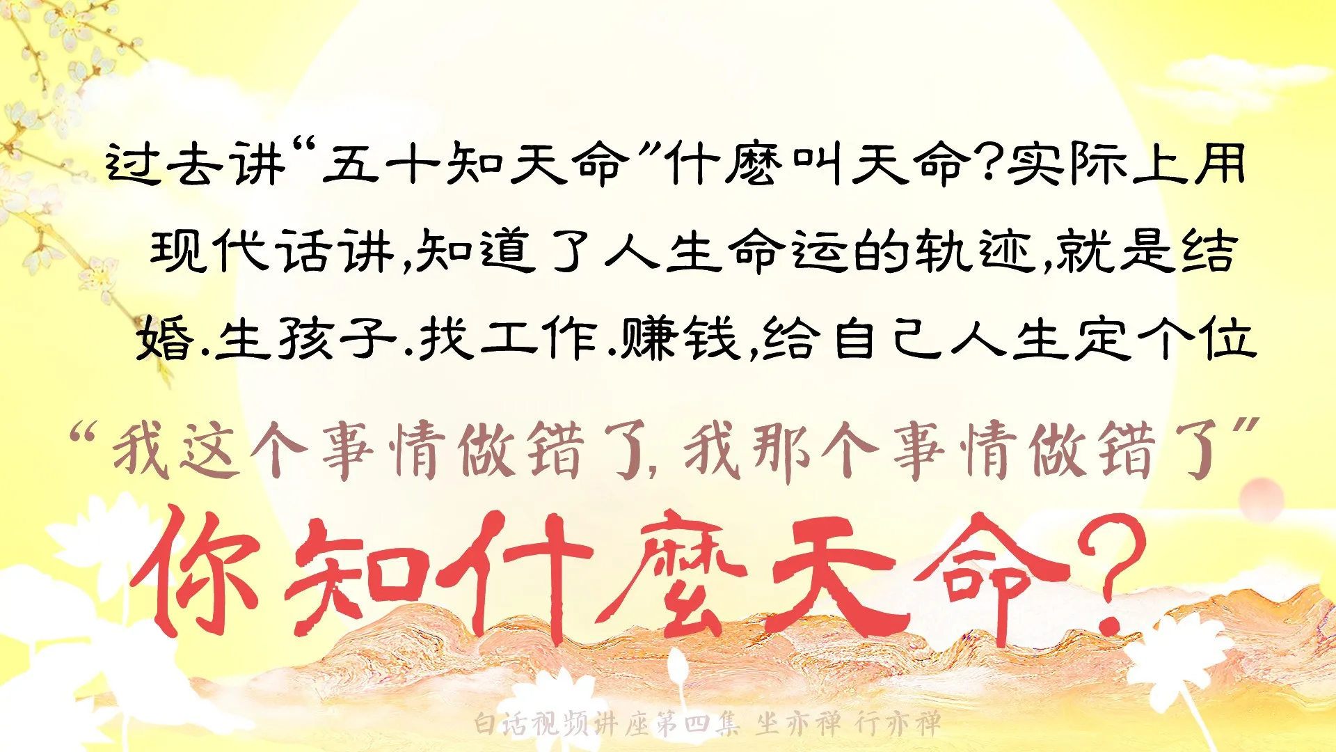 过去讲“五十知天命”。什么叫天命?实际上用现代话讲,知道了人生命运的轨迹,就是结婚、生孩子、找工作、赚钱,给自己人生定个位。“我这个事情做错了,我那个事情做错了”,你知什么天命?