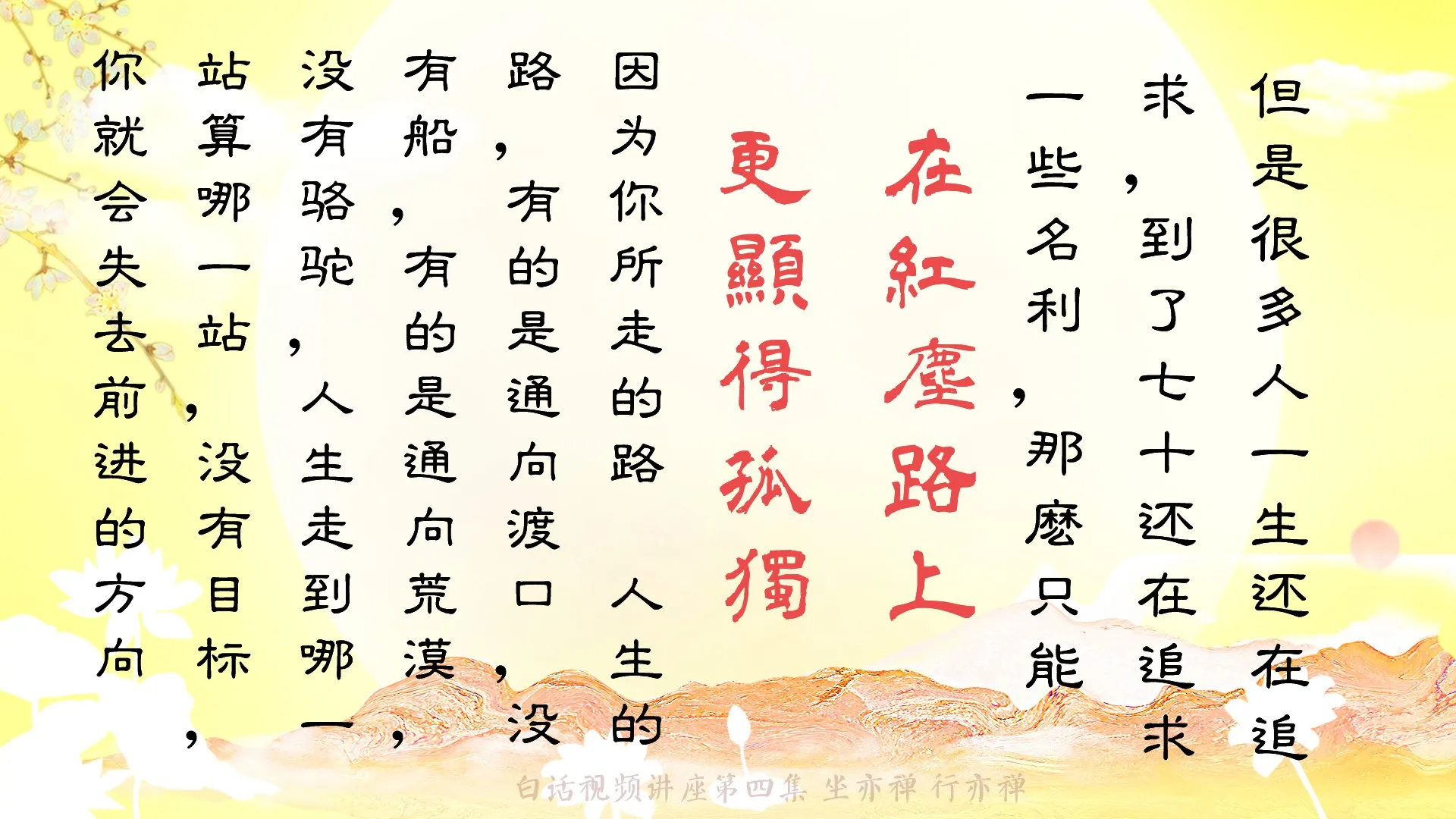 但是很多人一生还在追求,到了七十还在追求一些名利,那么只能在红尘路上更显得孤独。因为你所走的路、人生的路,有的是通向渡口,没有船,有的是通向荒漠,没有骆驼,人生走到哪一站算哪一站,没有目标,你就会失去前进的方向。