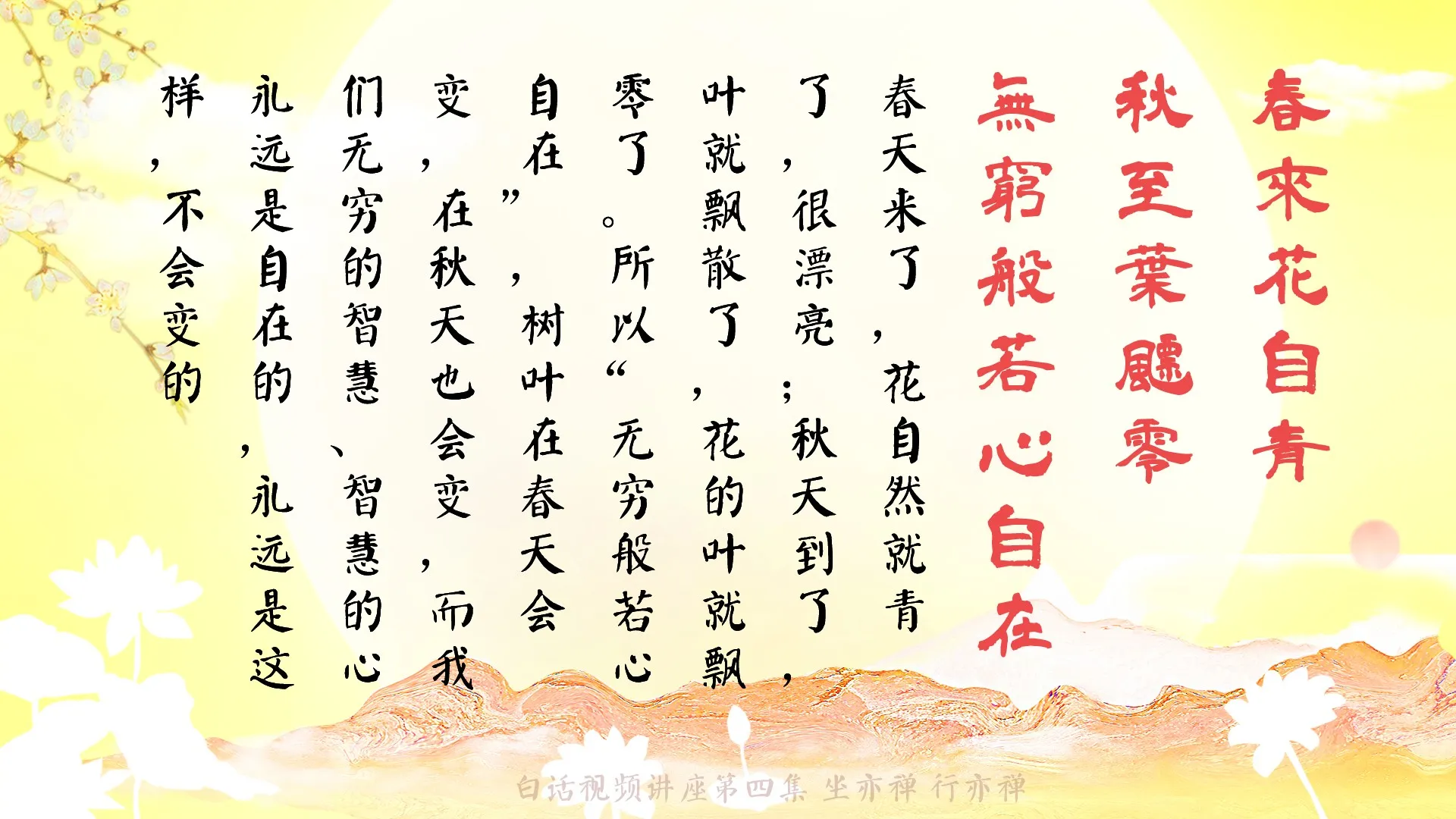 有一个诗人讲“春来花自青,秋至叶飘零”,什么意思?春天来了,花自然就青了,很漂亮;秋天到了,叶就飘散了,花的叶就飘零了。所以“无穷般若心自在”,树叶在春天会变,在秋天也会变,而我们无穷的智慧、智慧的心永远是自在的,永远是这样,不会变的。
