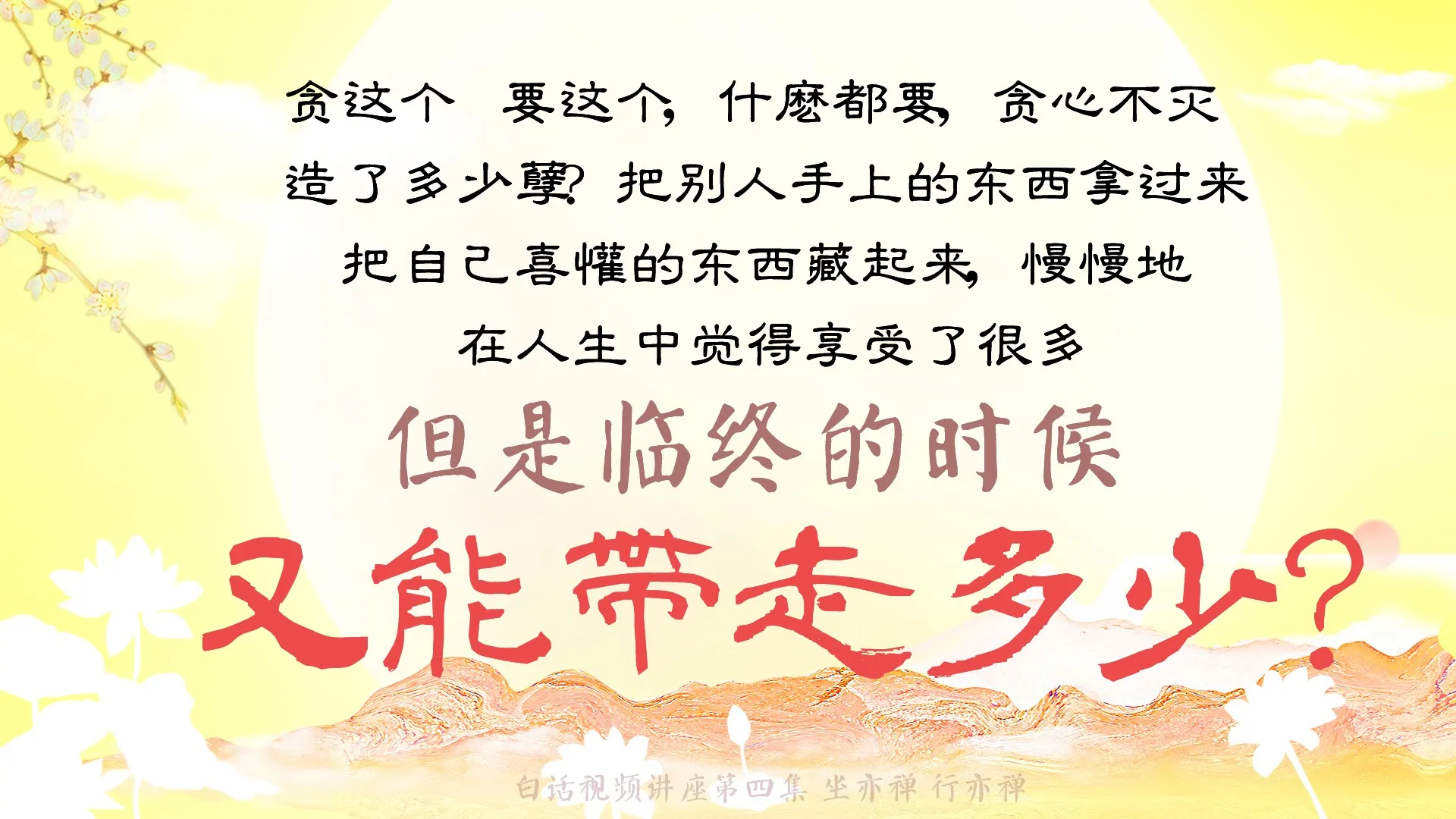 贪这个、要这个,什么都要,贪心不灭,造了多少孽?把别人手上的东西拿过来,把自己喜欢的东西藏起来,慢慢地在人生中觉得享受了很多,但是临终的时候又能带走多少?