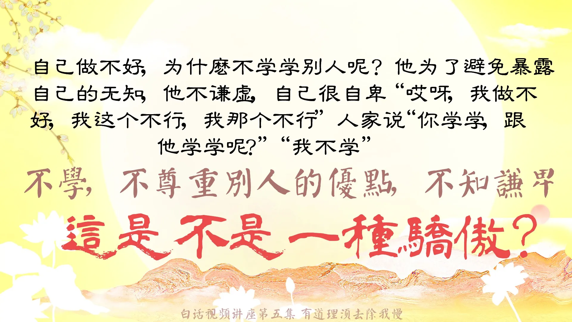 自己做不好,为什么不学学别人呢?他为了避免暴露自己的无知,他不谦虚,自己很自卑,“哎呀,我做不好,我这个不行,我那个不行”。人家说“你学学,跟他学学呢?”“我不学。”不学,不尊重别人的优点,不知谦卑,这是不是一种骄傲?