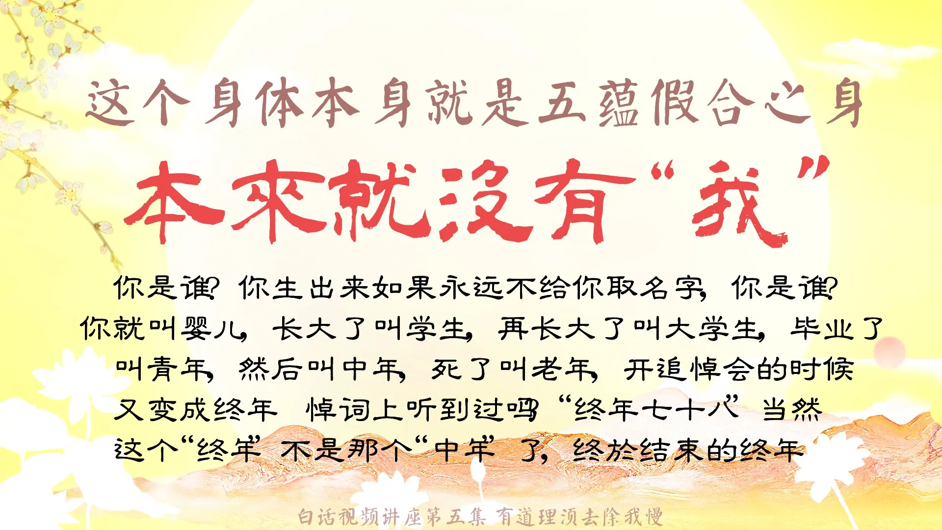 这个身体本身就是五蕴假合之身,本来就没有“我”,你是谁?你生出来如果永远不给你取名字,你是谁?你就叫婴儿,长大了叫学生,再长大了叫大学生,毕业了叫青年,然后叫中年,死了叫老年,开追悼会的时候又变成终年。悼词上听到过吗?“终年七十八”。当然这个“终年”不是那个“中年”了,终于结束的终年。
