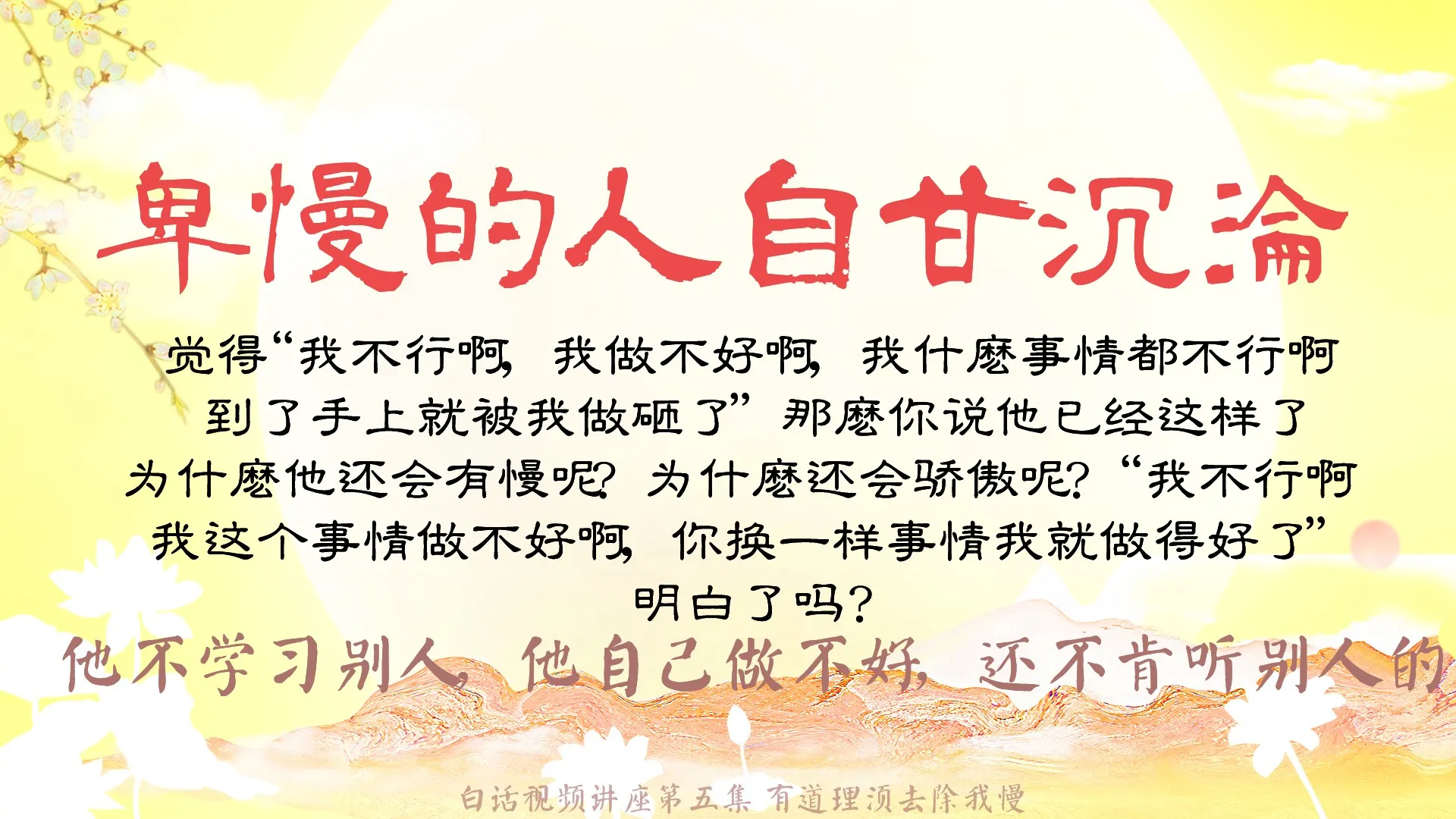 卑慢的人自甘沉沦,觉得“我不行啊,我做不好啊,我什么事情都不行啊,到了手上就被我做砸了”。那么你说他已经这样了,为什么他还会有慢呢?为什么还会骄傲呢?“我不行啊,我这个事情做不好啊,你换一样事情我就做得好了”,明白了吗?他不学习别人,他自己做不好,还不肯听别人的。
