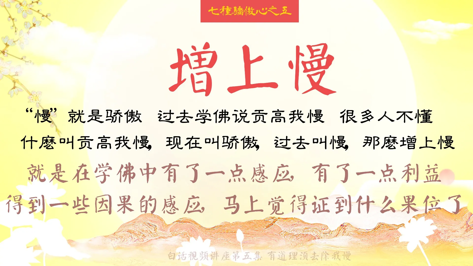 第五,增上慢。“慢”就是骄傲。过去学佛说贡高我慢,很多人不懂什么叫贡高我慢。现在叫骄傲,过去叫慢,那么增上慢。就是在学佛中有了一点感应,有了一点利益,得到一些因果的感应,马上觉得证到什么果位了。